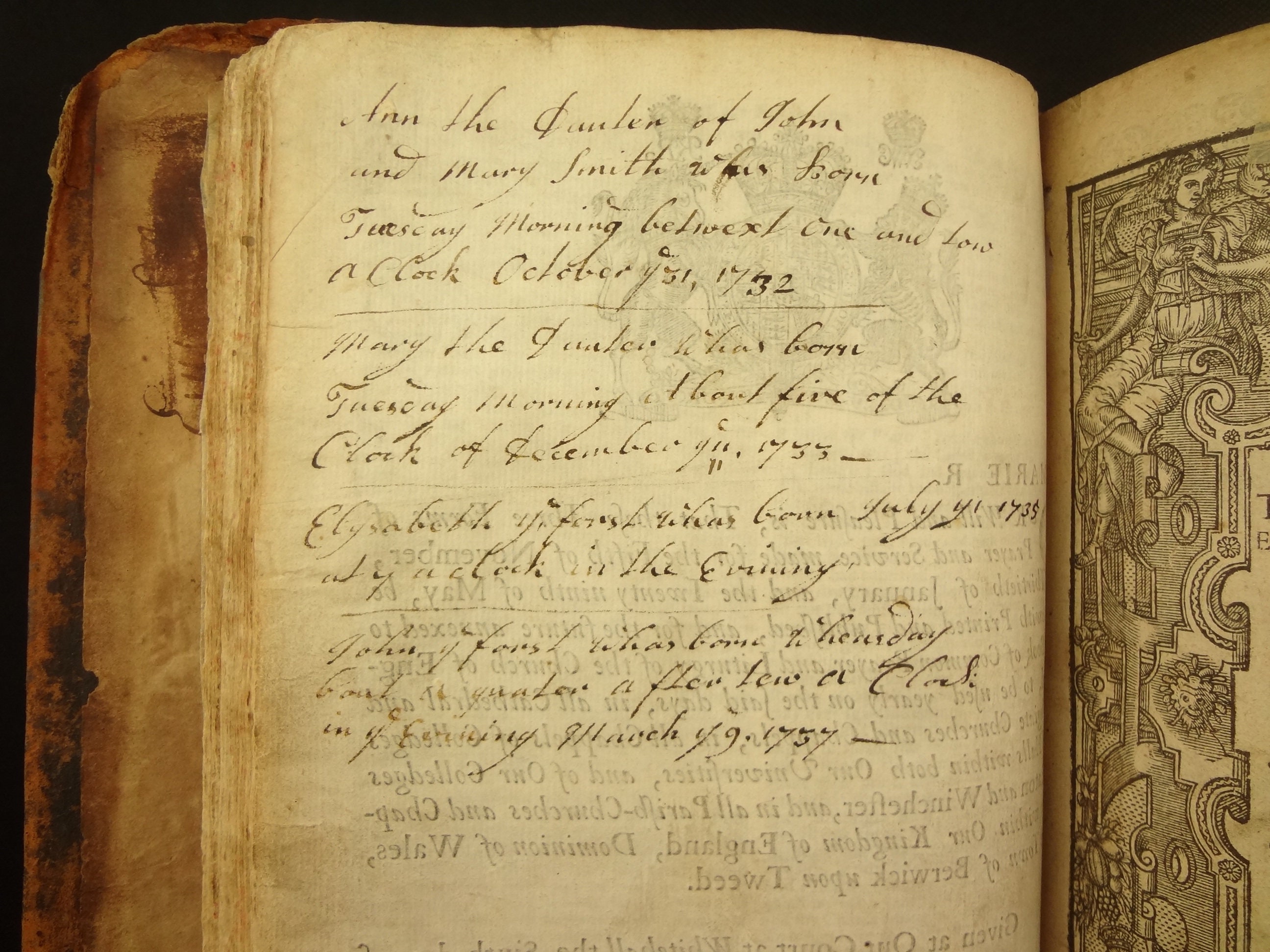 A well-worn copy of the 1597 Geneva Bible, with many provenance annotations throughout, and some genealogical notes. Bound together with a Book of Common Prayer (circa 1630), Two Rightful Profitable and Fruitfull Concordances (1597), and The Whole Booke of Psalms (1595).