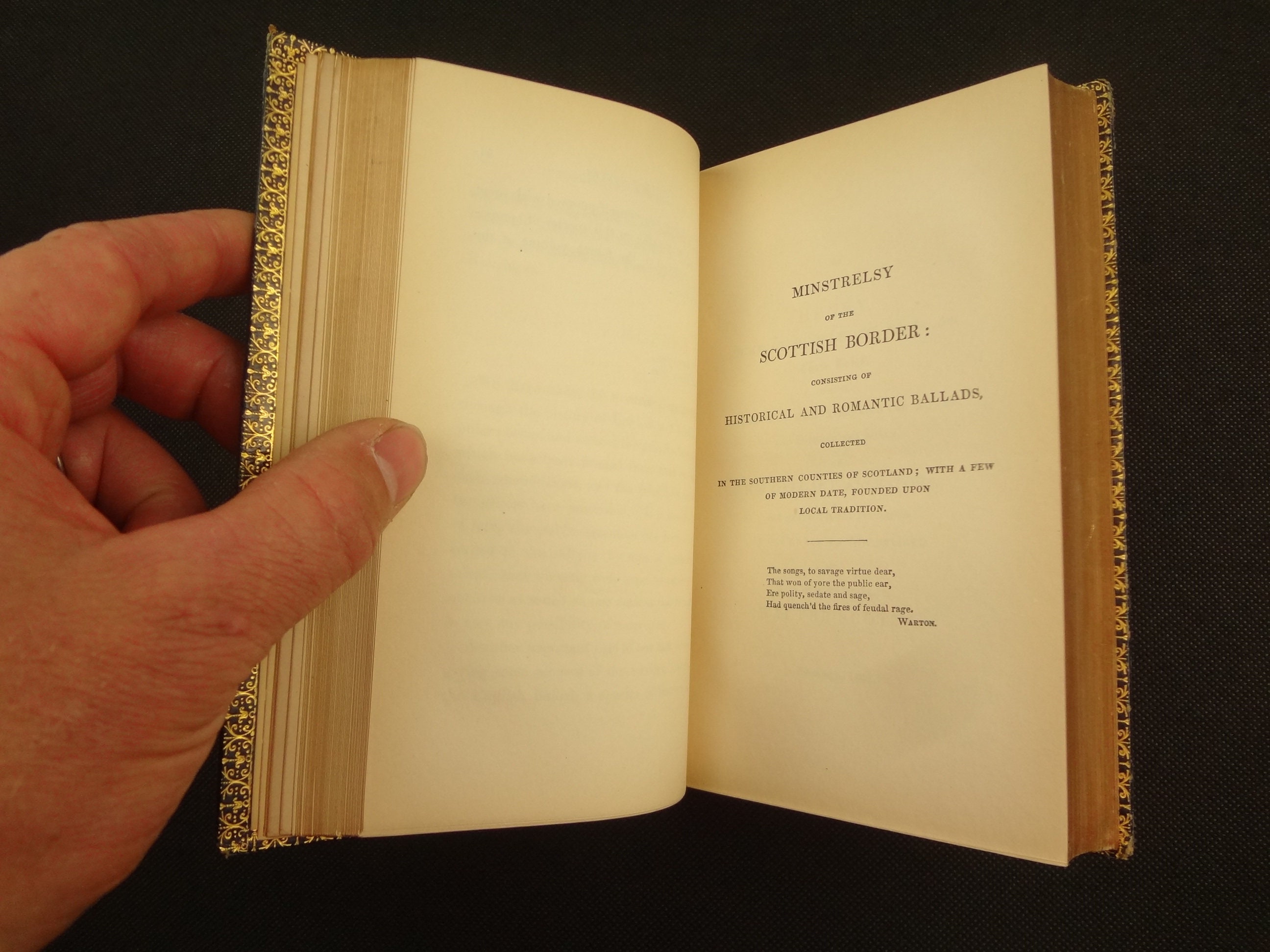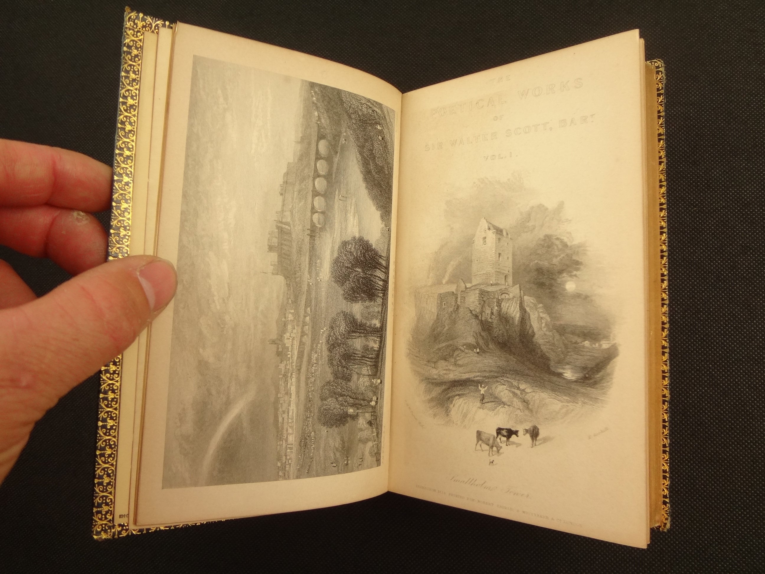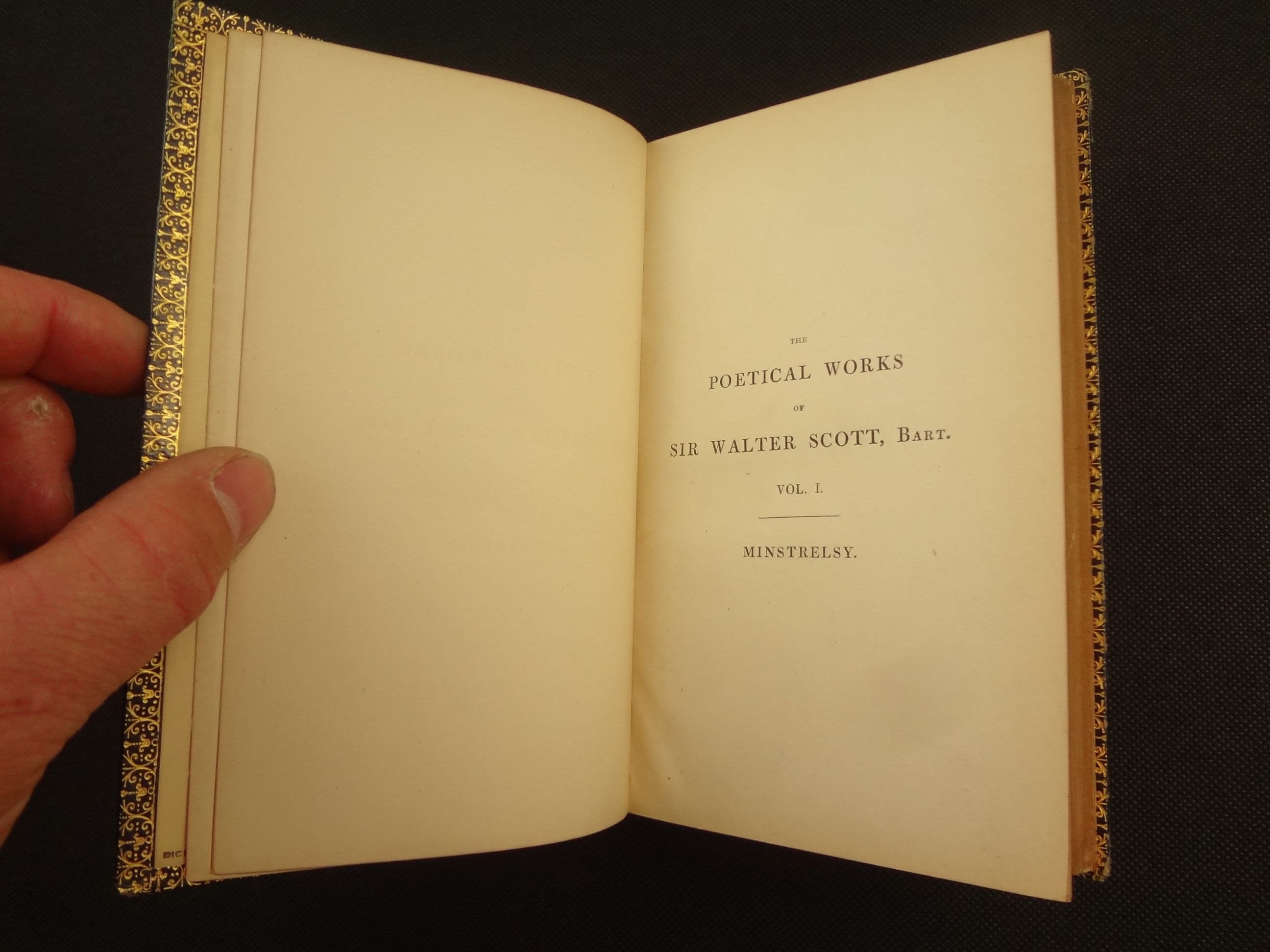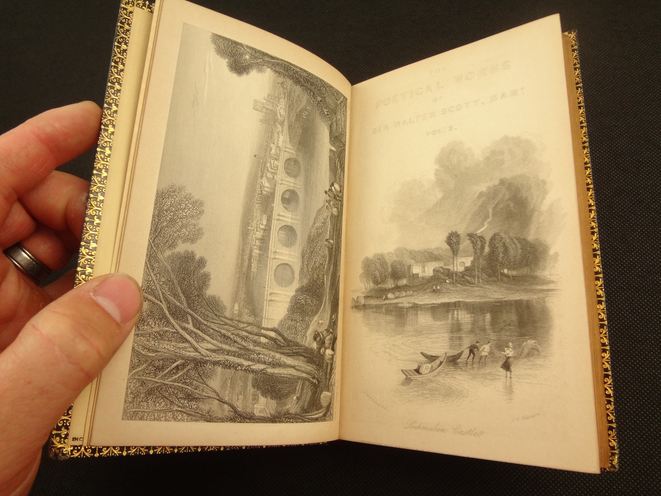 Each volume measures approx. 16.5 x 11 x 2.75 cm. Faux shagreen blue leather with triple fillet blind borders on boards. Spines with five raised bands, "Scott's Poetical Works" in gilt in one compartment, and volume and title in gilt in second compartment. Turn-ins rolled with gilt roll tool reminiscent of 18th century french dentelle works. All edges gilt (AEG). White and red endbands. Silk ribbons. Complete set, in twelve volumes. Frontis and title page illustrated in each volume after art by J.M.W. Turner. Bindings by Bickers and Son, London.