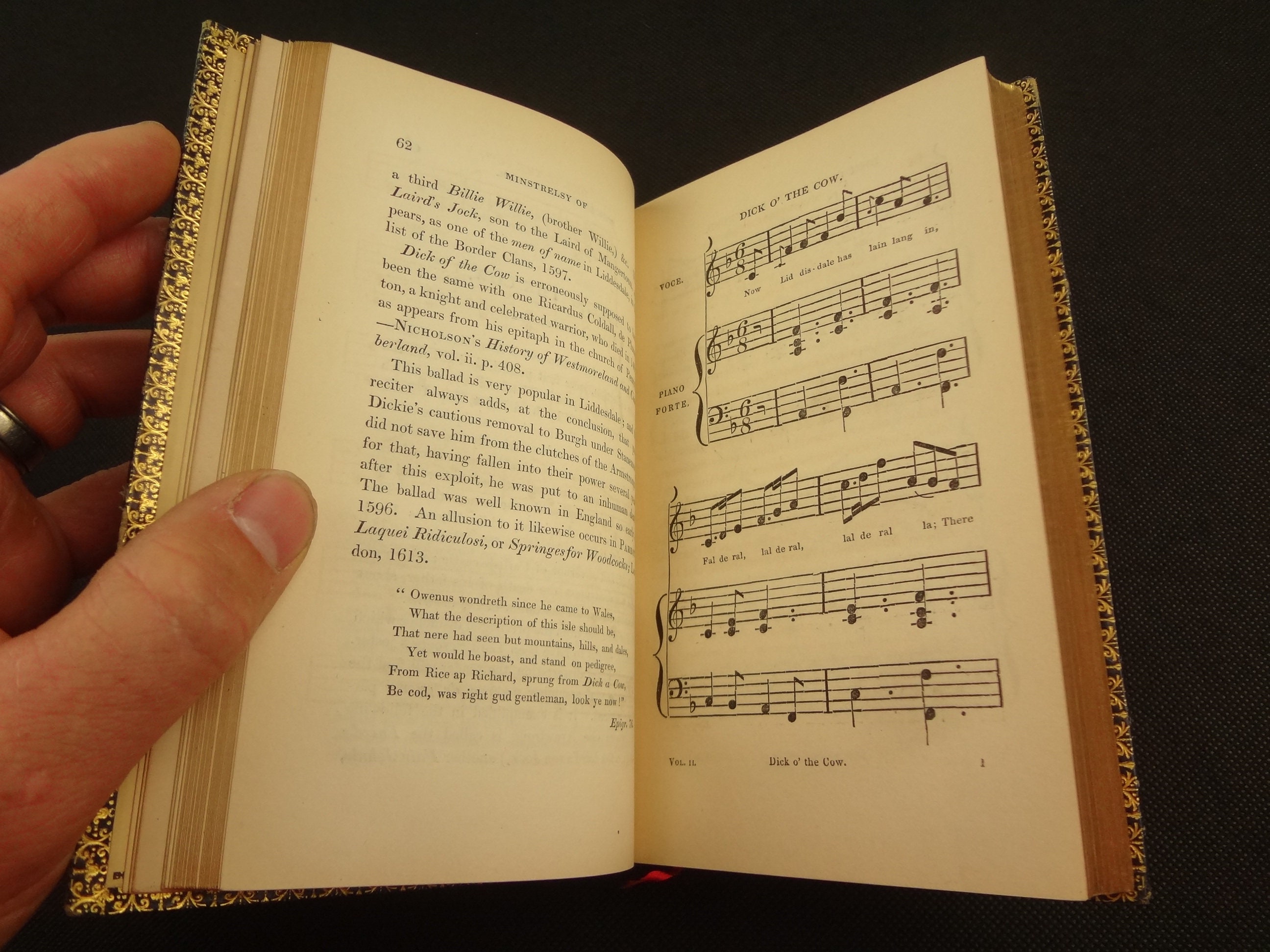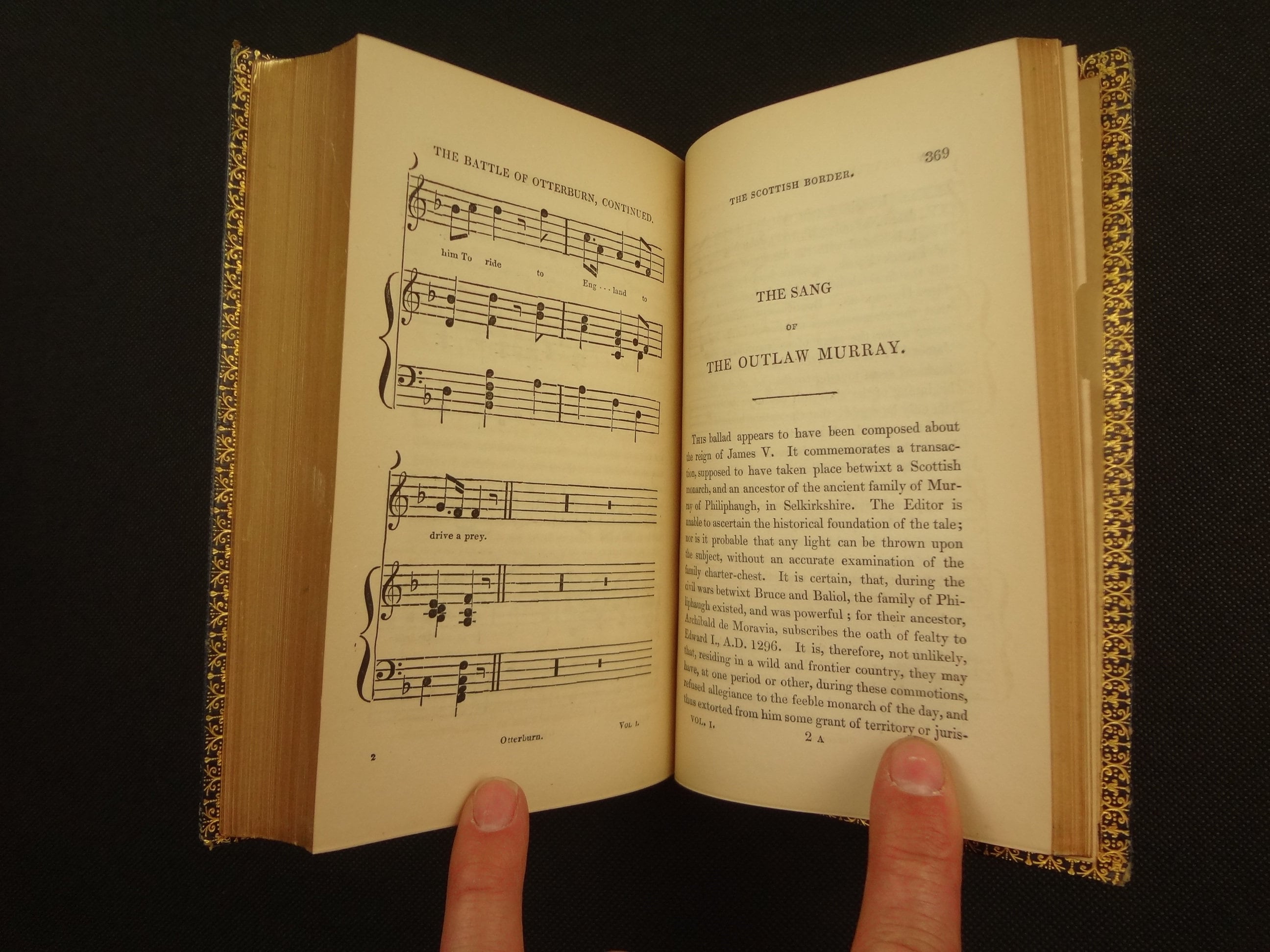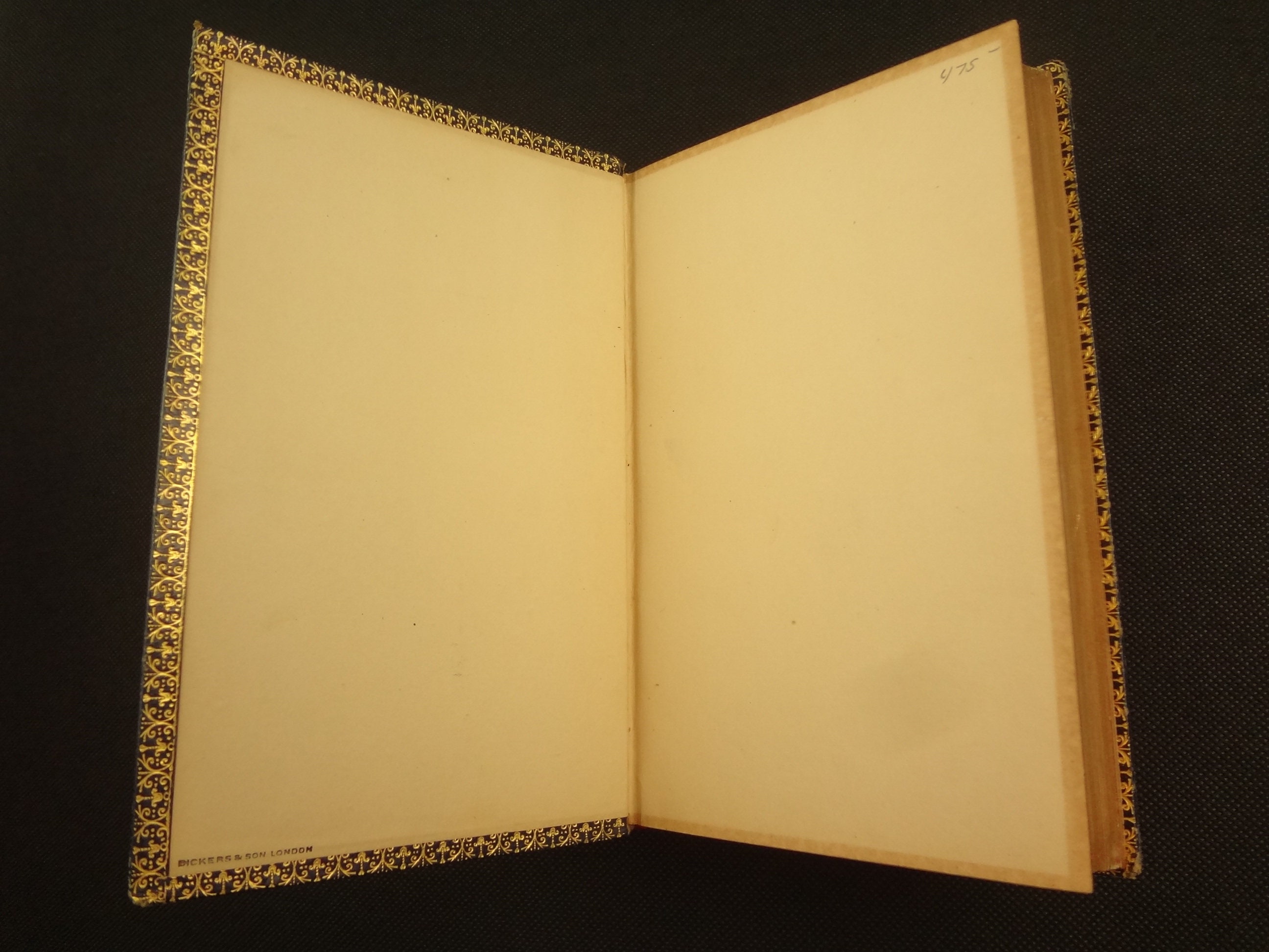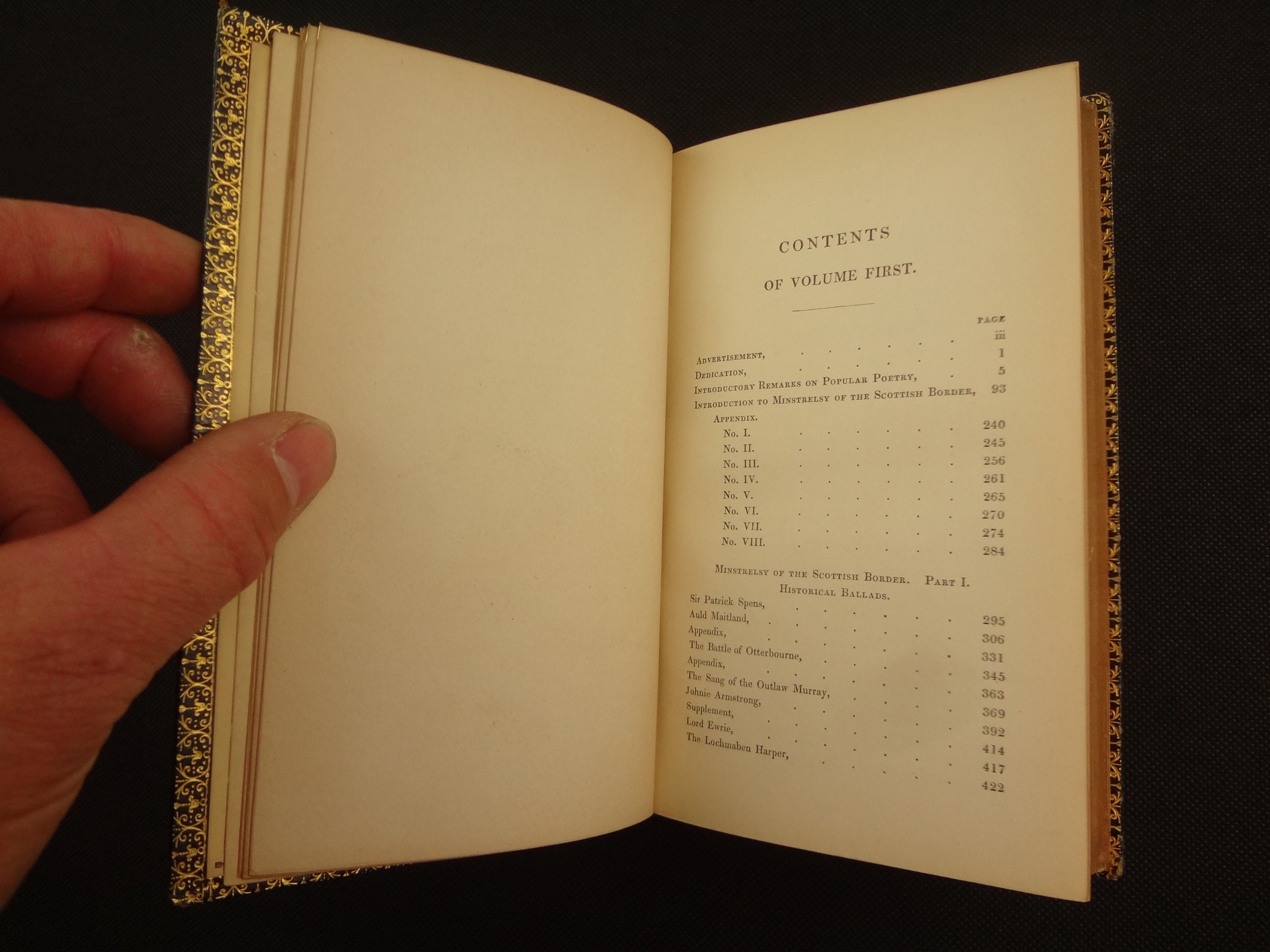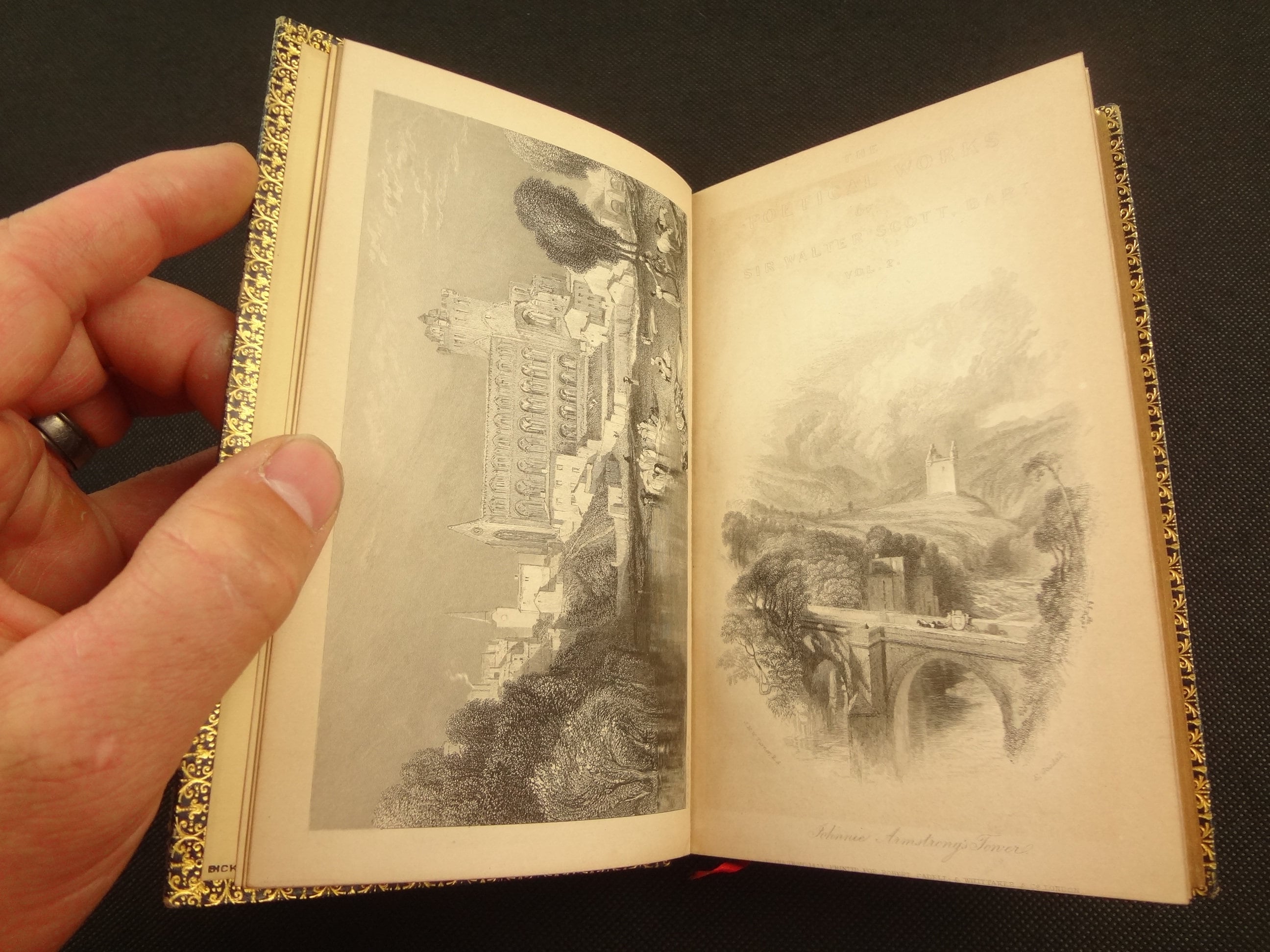 Each volume measures approx. 16.5 x 11 x 2.75 cm. Faux shagreen blue leather with triple fillet blind borders on boards. Spines with five raised bands, "Scott's Poetical Works" in gilt in one compartment, and volume and title in gilt in second compartment. Turn-ins rolled with gilt roll tool reminiscent of 18th century french dentelle works. All edges gilt (AEG). White and red endbands. Silk ribbons. Complete set, in twelve volumes. Frontis and title page illustrated in each volume after art by J.M.W. Turner. Bindings by Bickers and Son, London.