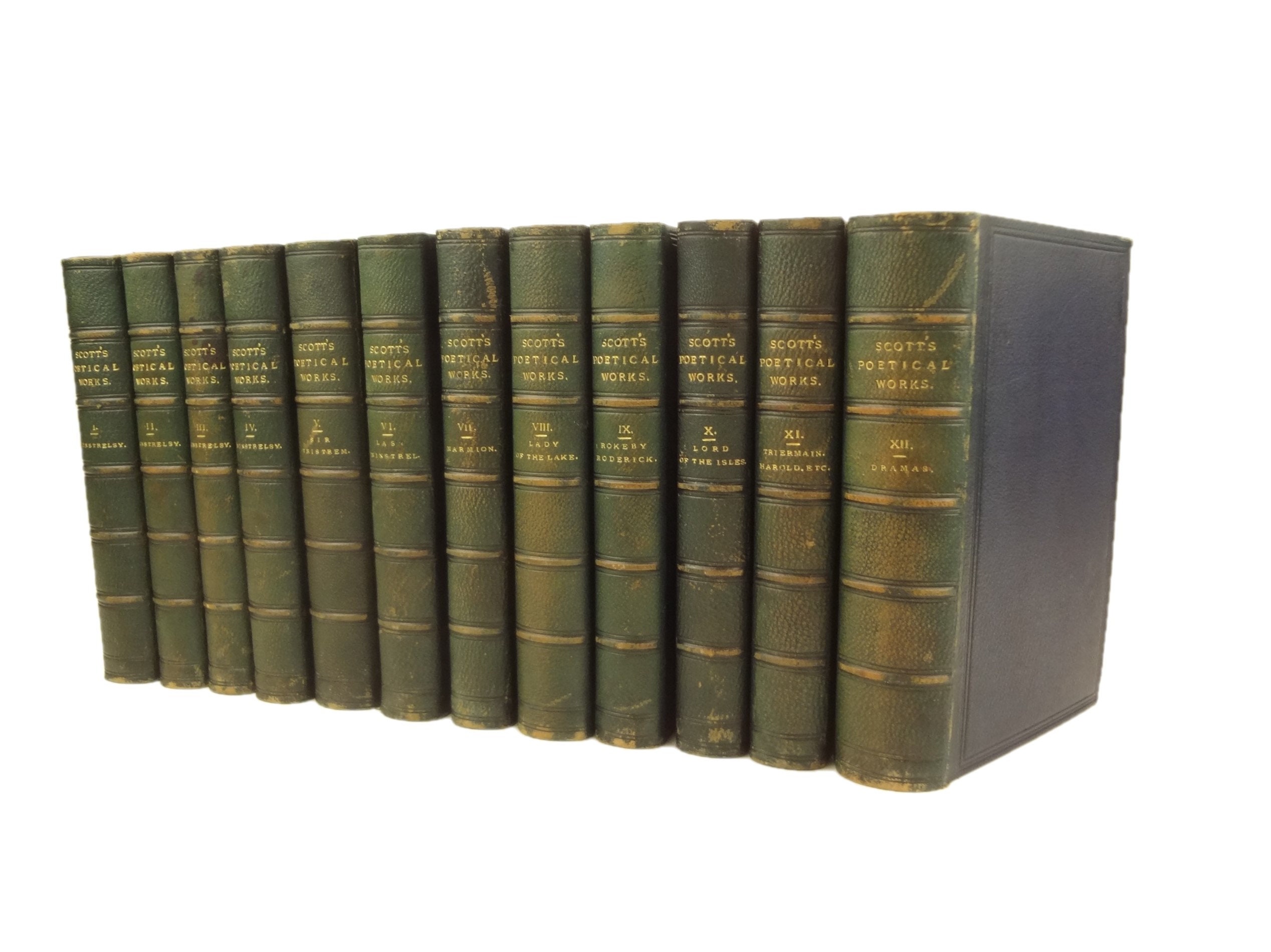 A handsome, complete, set of Sir Walter Scott's Poetical Works, with frontis and title page illustrations after J.M.W. Turner art. Printed in Edinburgh between 1833 and 1834 at the printing house of Robert Cadell. In this set you'll find such classics as The Lady of the Lake, Sir Tristrem, Rokeby, Mistrelsy, etc.. Bound modestly, but with the quality they're known for, by the Bickers & Son bindery in London.