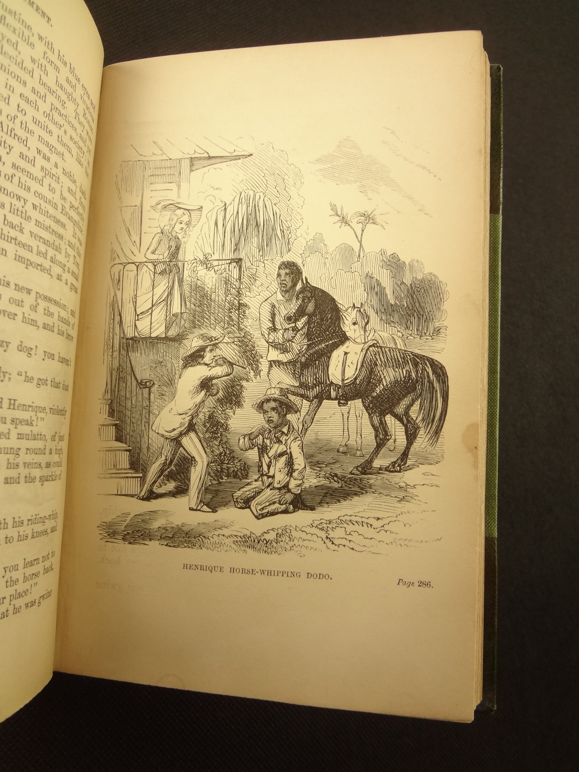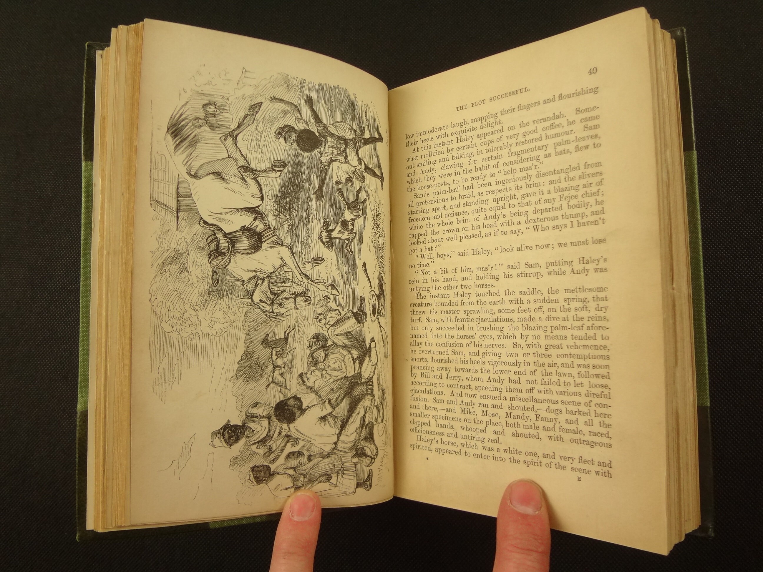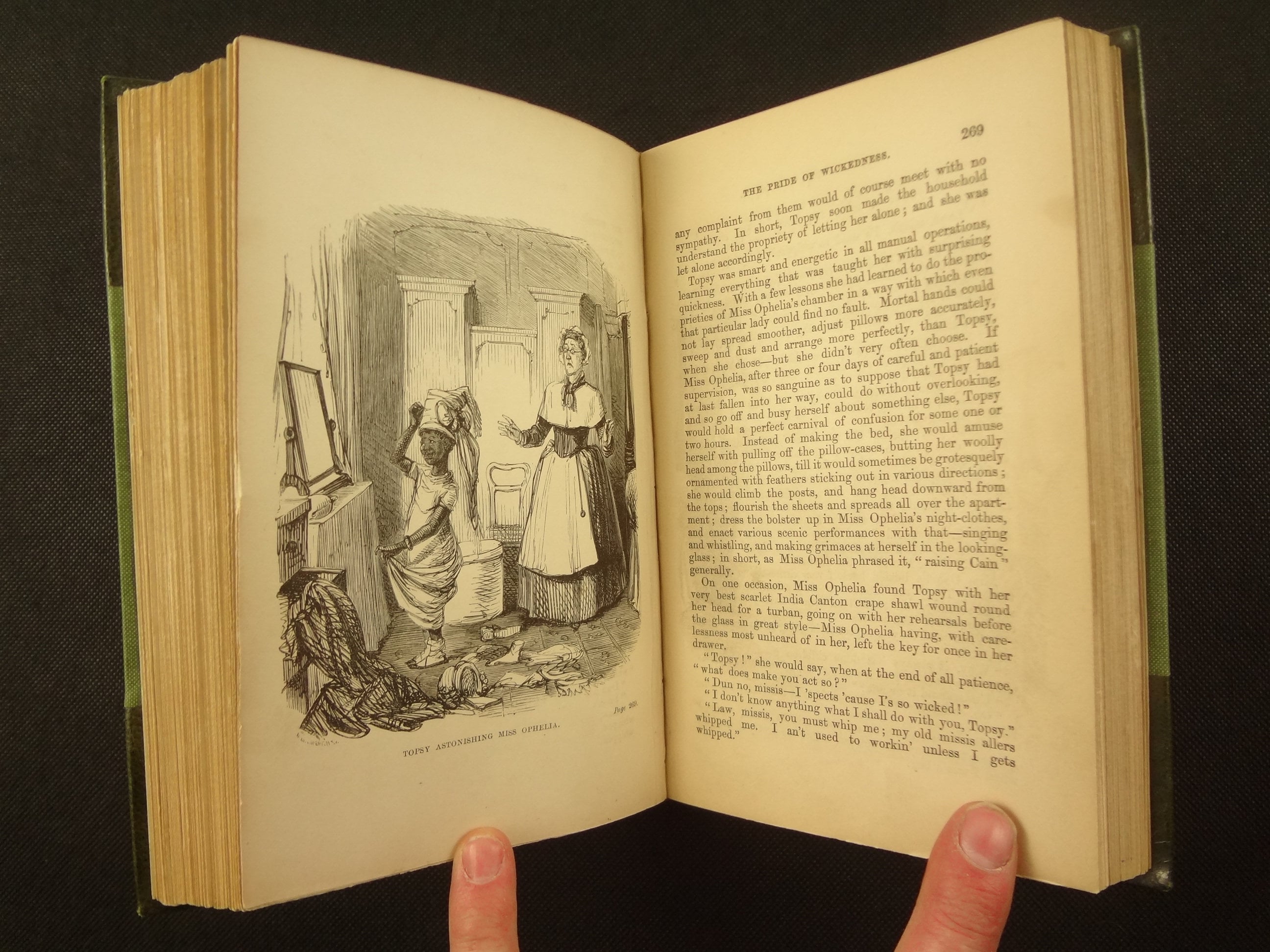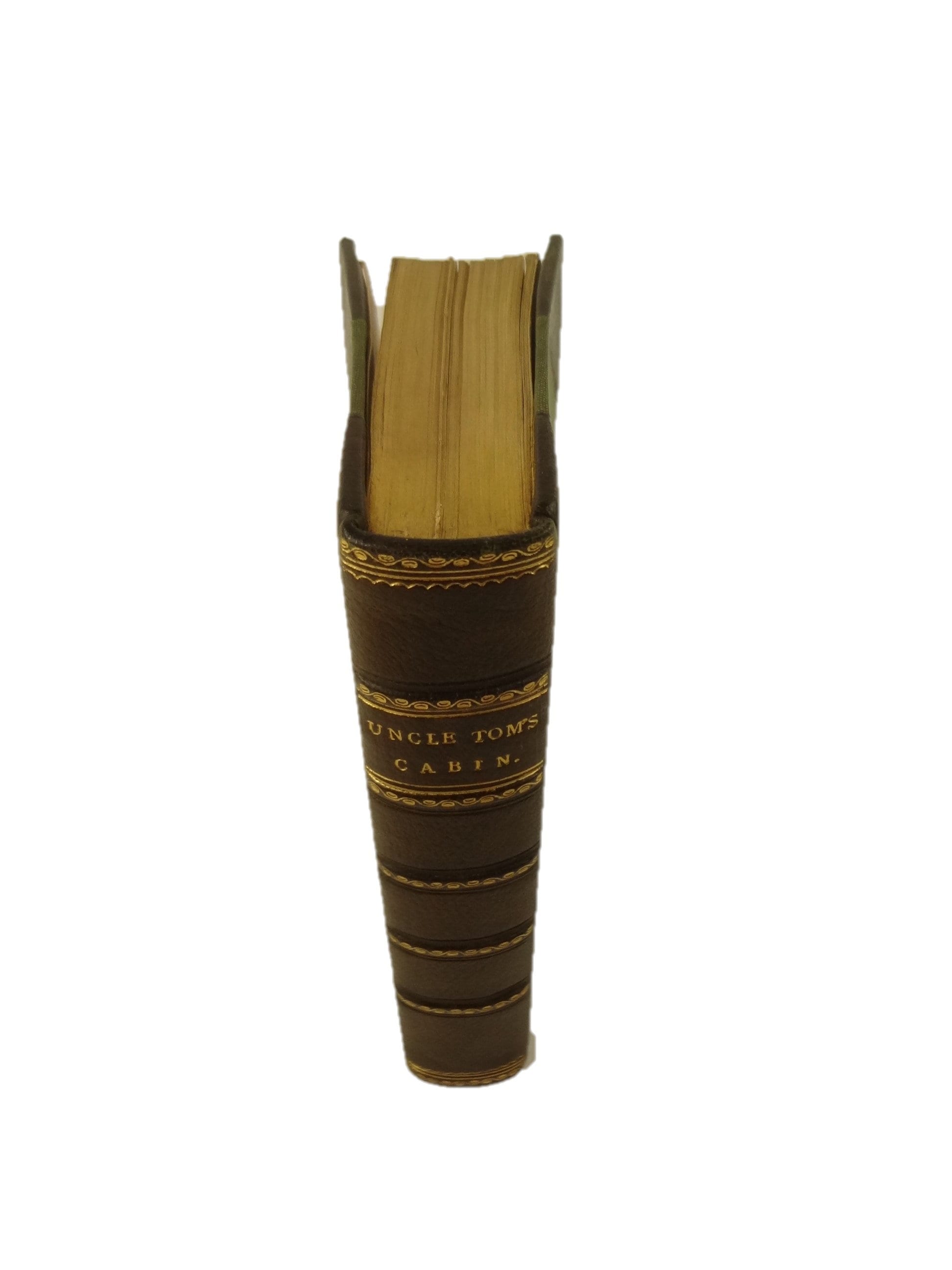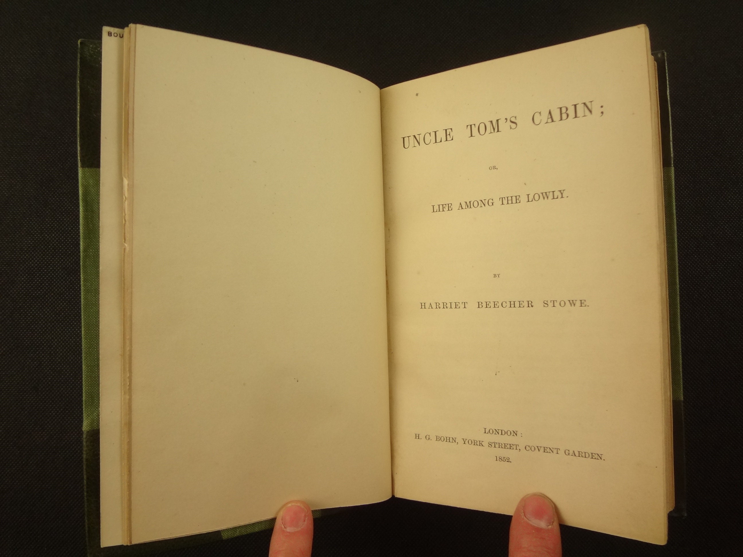 A copy of an infamous 1852 pirated Uncle Tom's Cabin. The printer, Bohn, was a noted offender of copyright (see his fight with Webster, regarding the dictionary). The weak international copyright laws, allowed Bohn to bring this copy to press almost alongside the official 1st English edition. This is an early copy of Bohn's efforts in 1852; he later added an introduction from a Reverend.