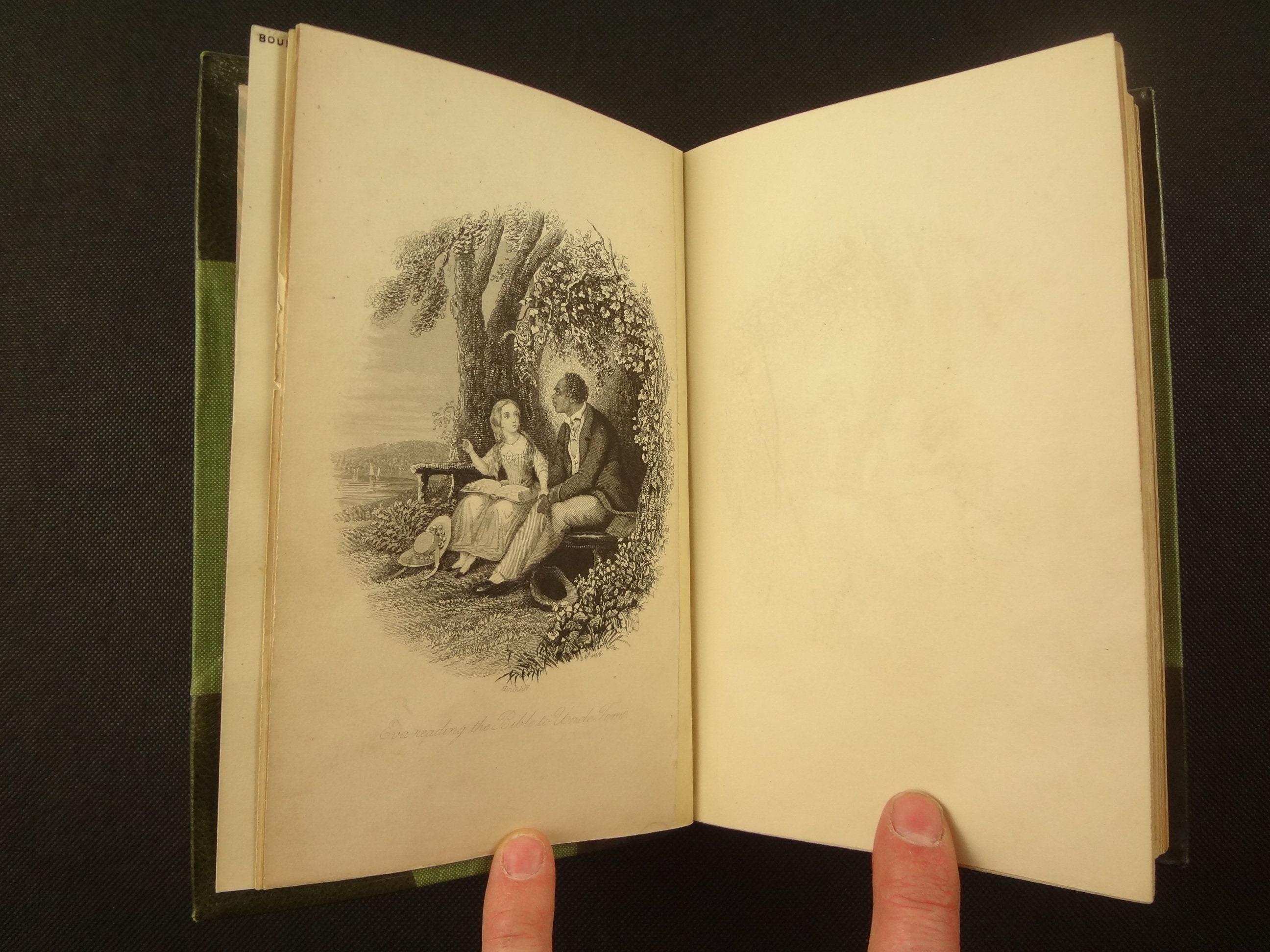 See pictures. Boards are bowed, leaving the fore-edge splayed, else it's a nice binding with just a touch of edge wear. Very clean at top-edge, likely well kept and cared for. Many bookseller notes on recto of flyleaf and 1st blank unpaginated page. Bookseller stamp at top of flyleaf verso. Wrinkling at fore-edge of 1st blank and half title. Some thumbing to frontis, title, page and several pages following. Occasional thumb and spot throughout, but mostly quite clean. Plate at 268 extends just a tad farther out and has a tiny chip along fore-edge as a result.