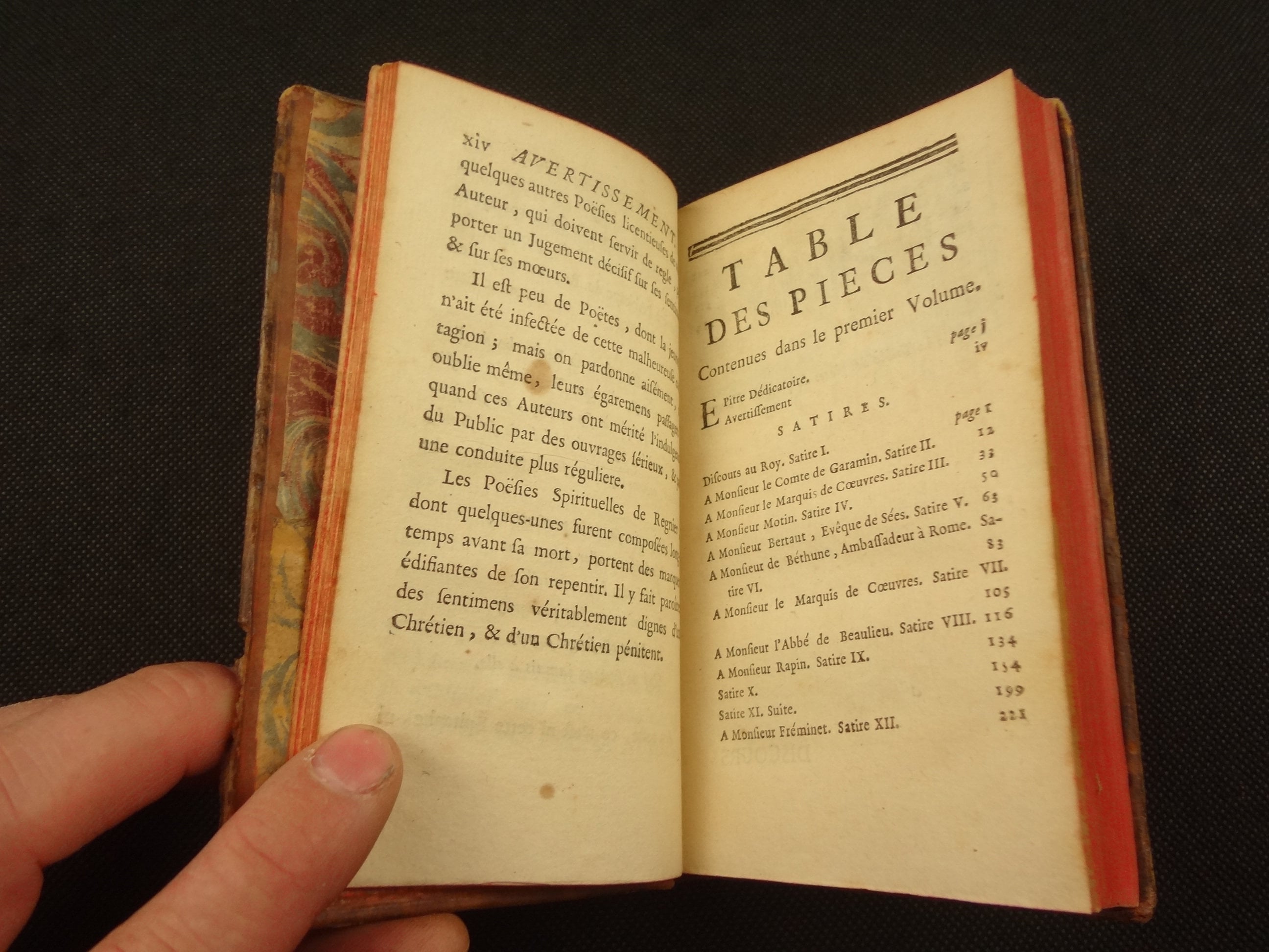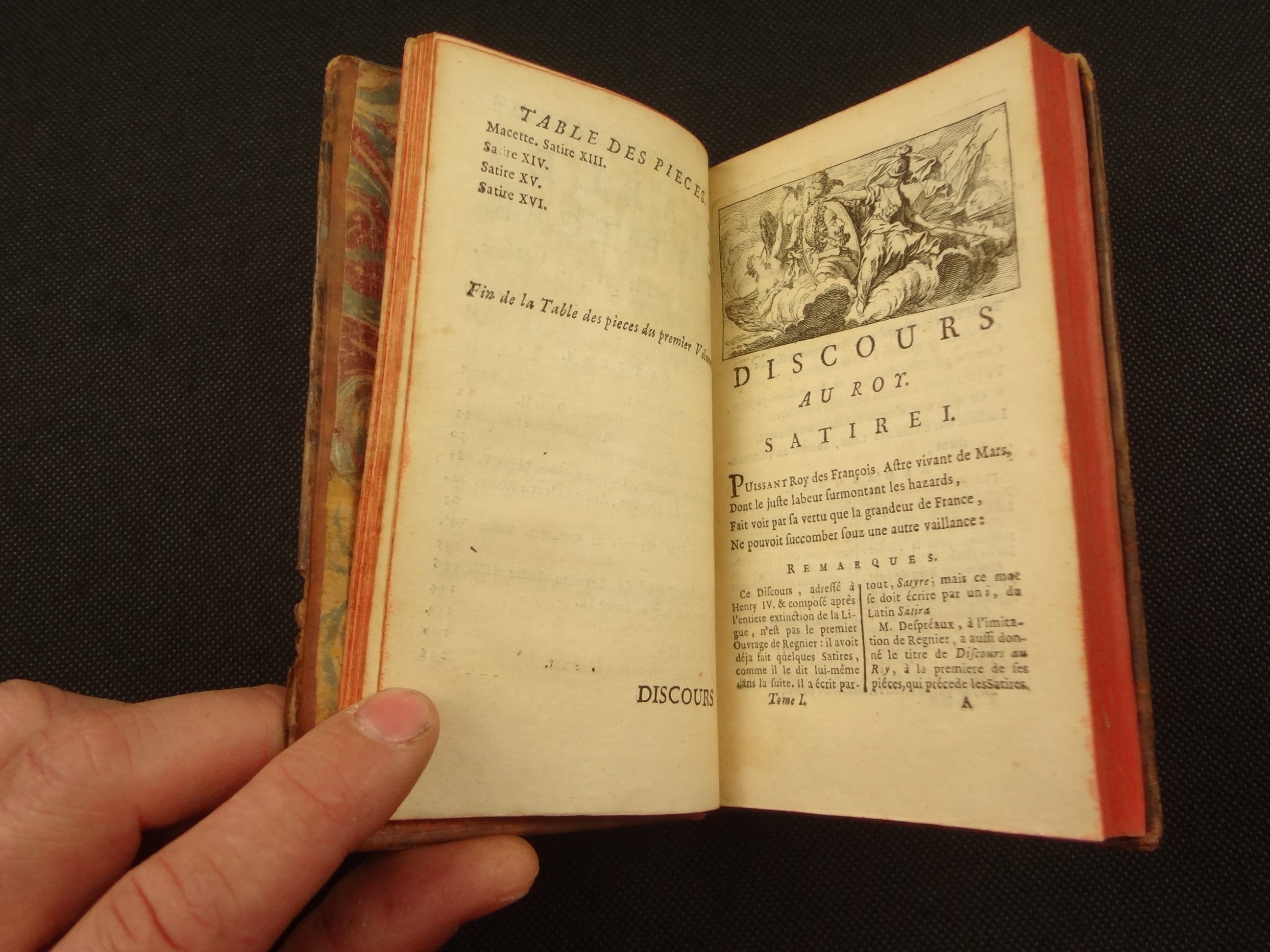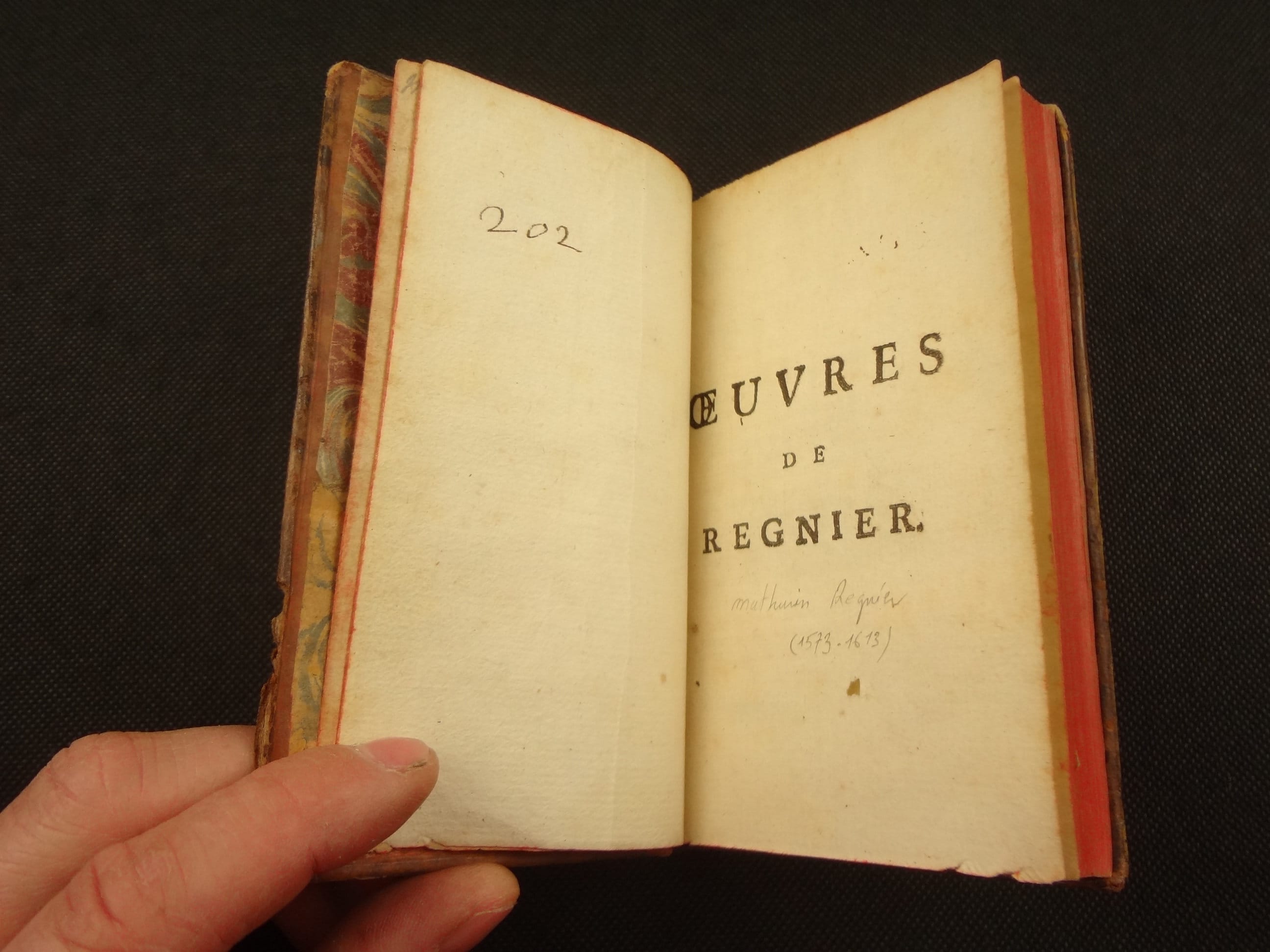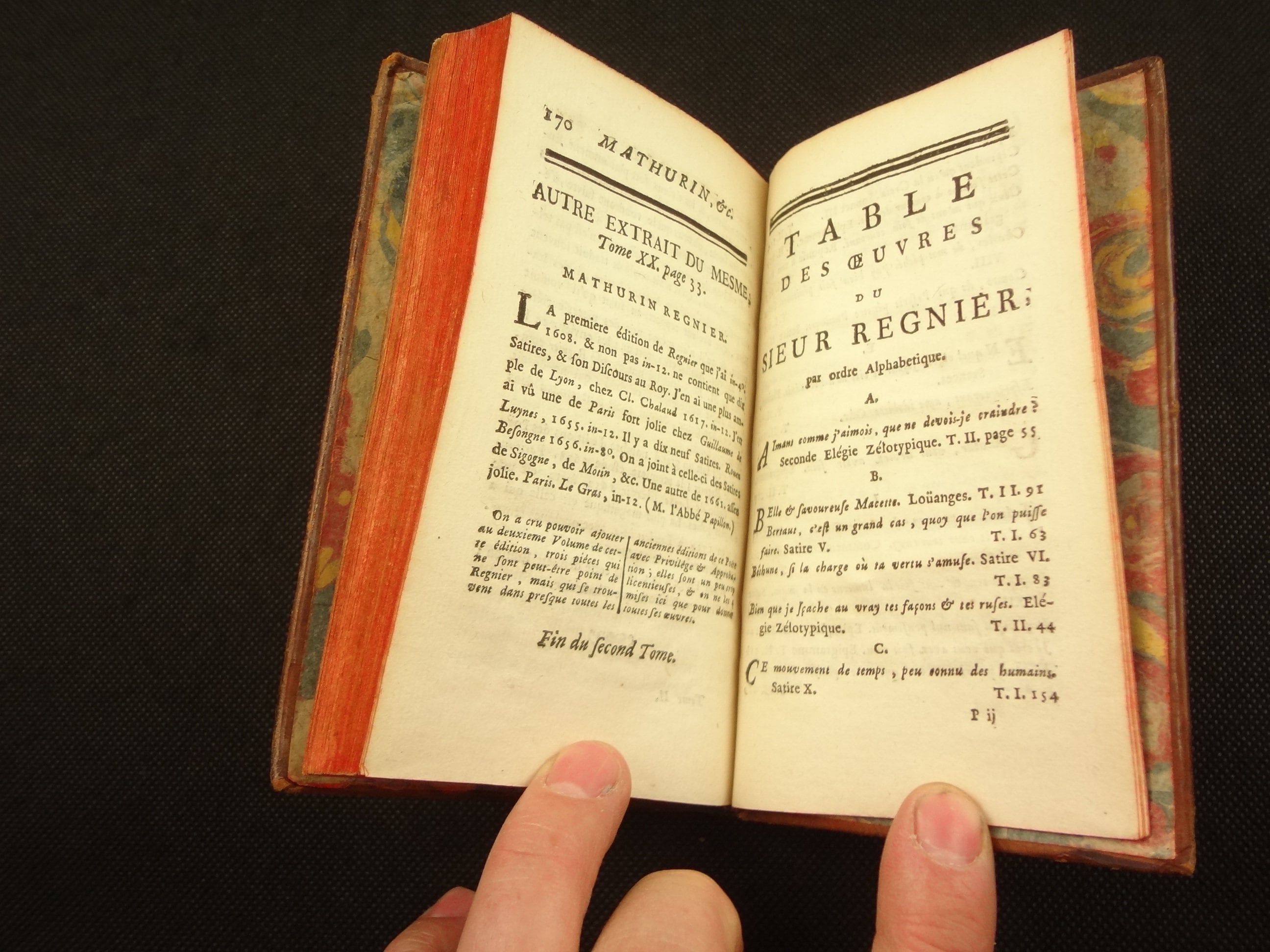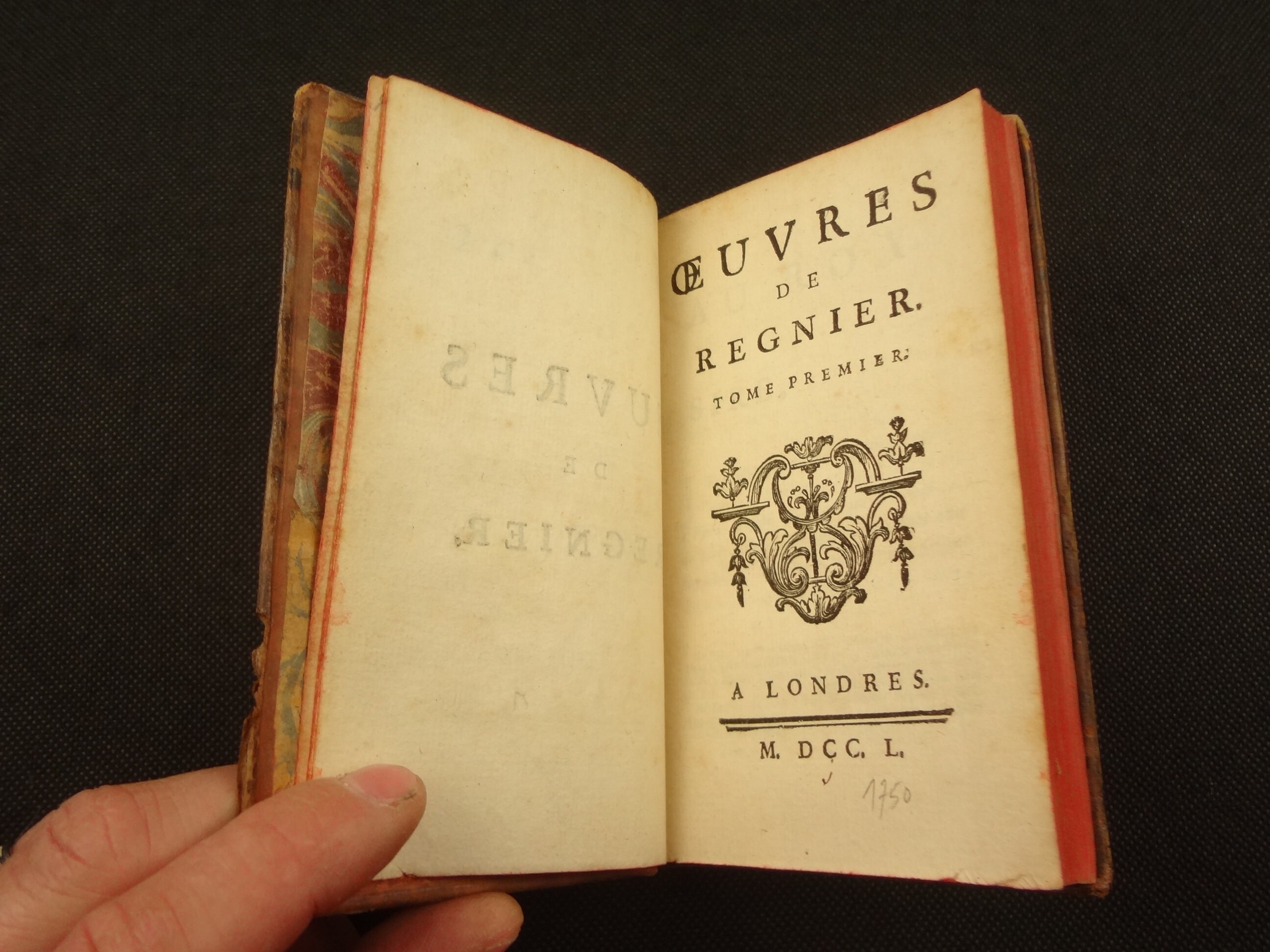 A handsome two-volume 1750 set (in French) of the Works of Mathurin Regnier, satirist. Attractive "cat's-paw" bindings.