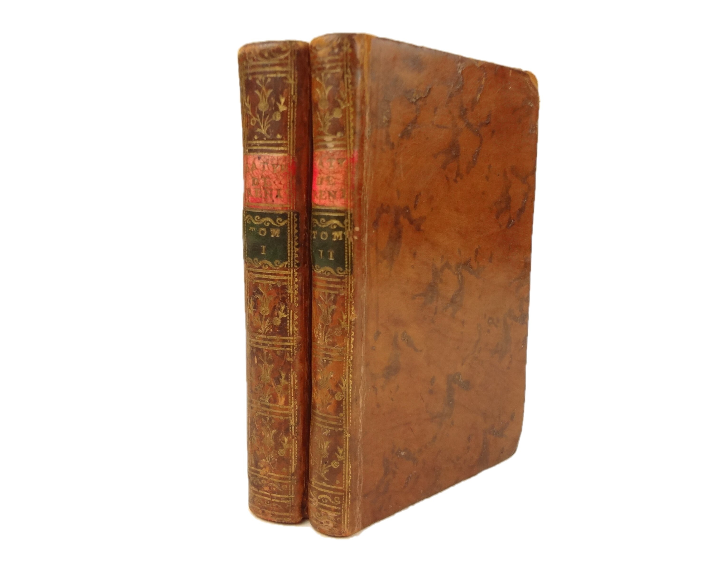 See pictures. Attractive bindings. A littl signs of wear, with some edge chipping, corner wear, and 1.5 cm. of damage at the bottom of tome 1's joint. Mostly quite attractive though. Top-edge a little darkened from dust. Bookseller notes all over blank front endpapers and half-title. Checkmark and pencil 1750 written at bottom of title page. Text block is clean, with only an occasional spot, and an occasionally toned page. Volume two has no writing, and just a tiny bit more toning and spotting.