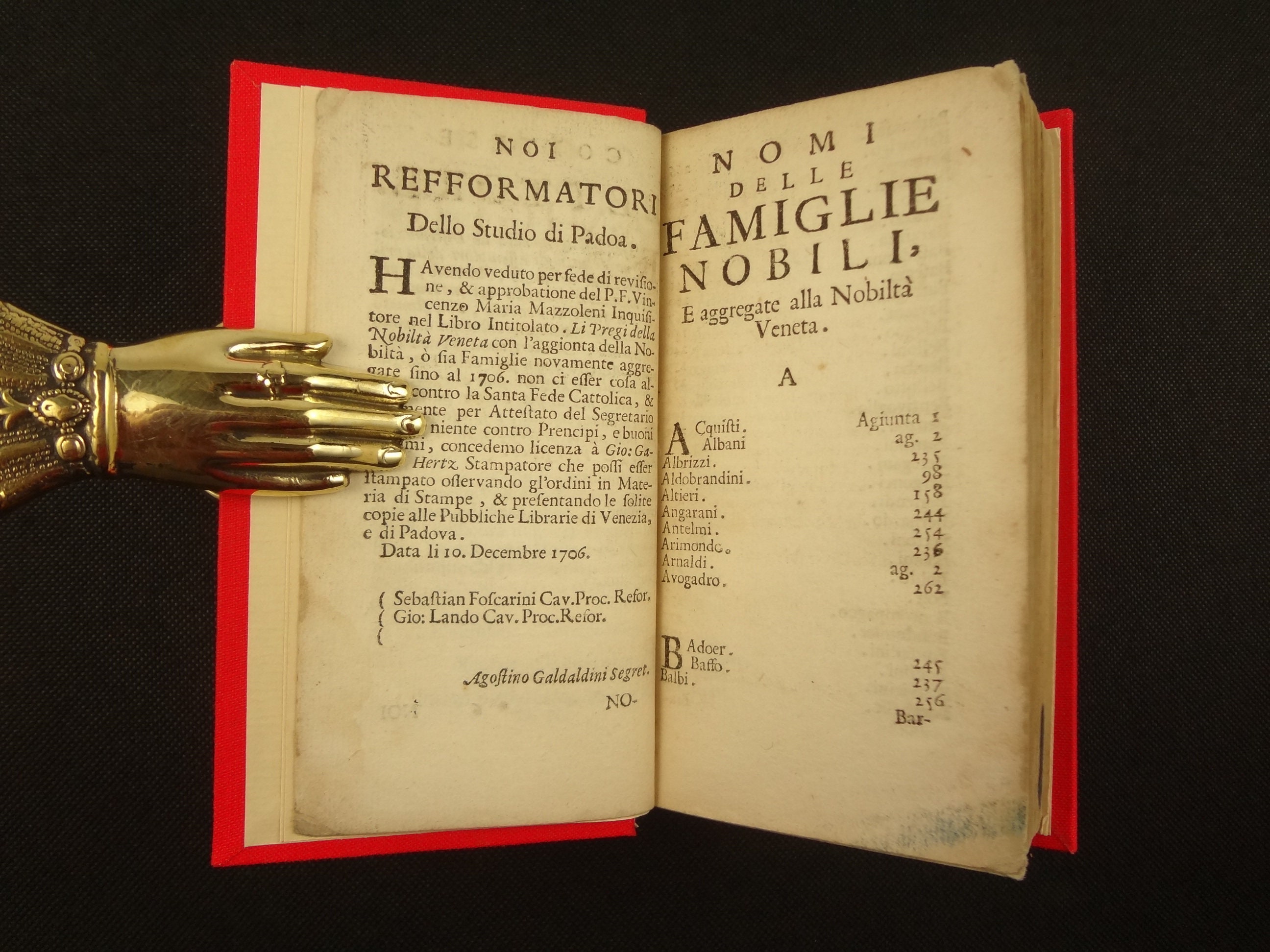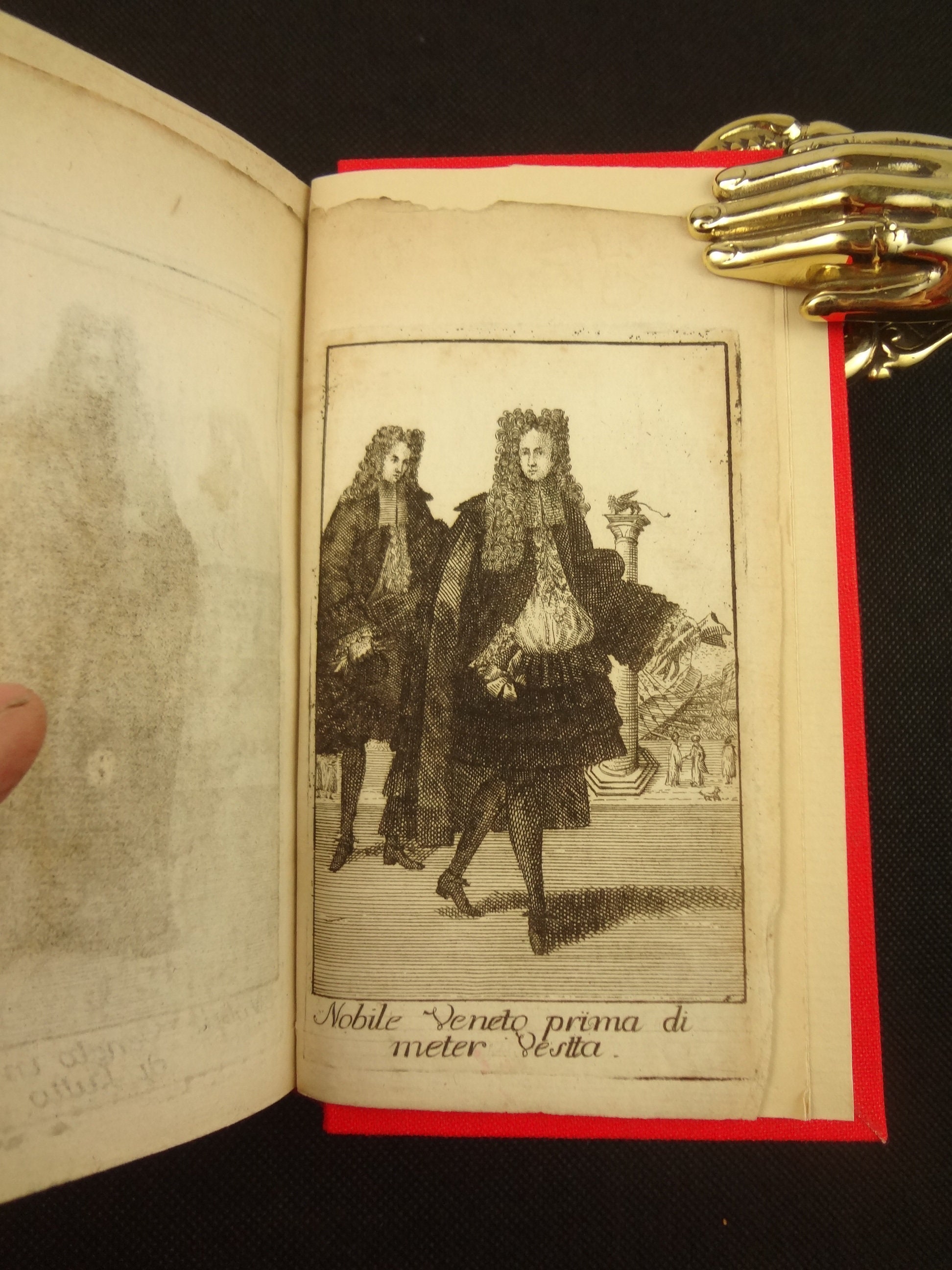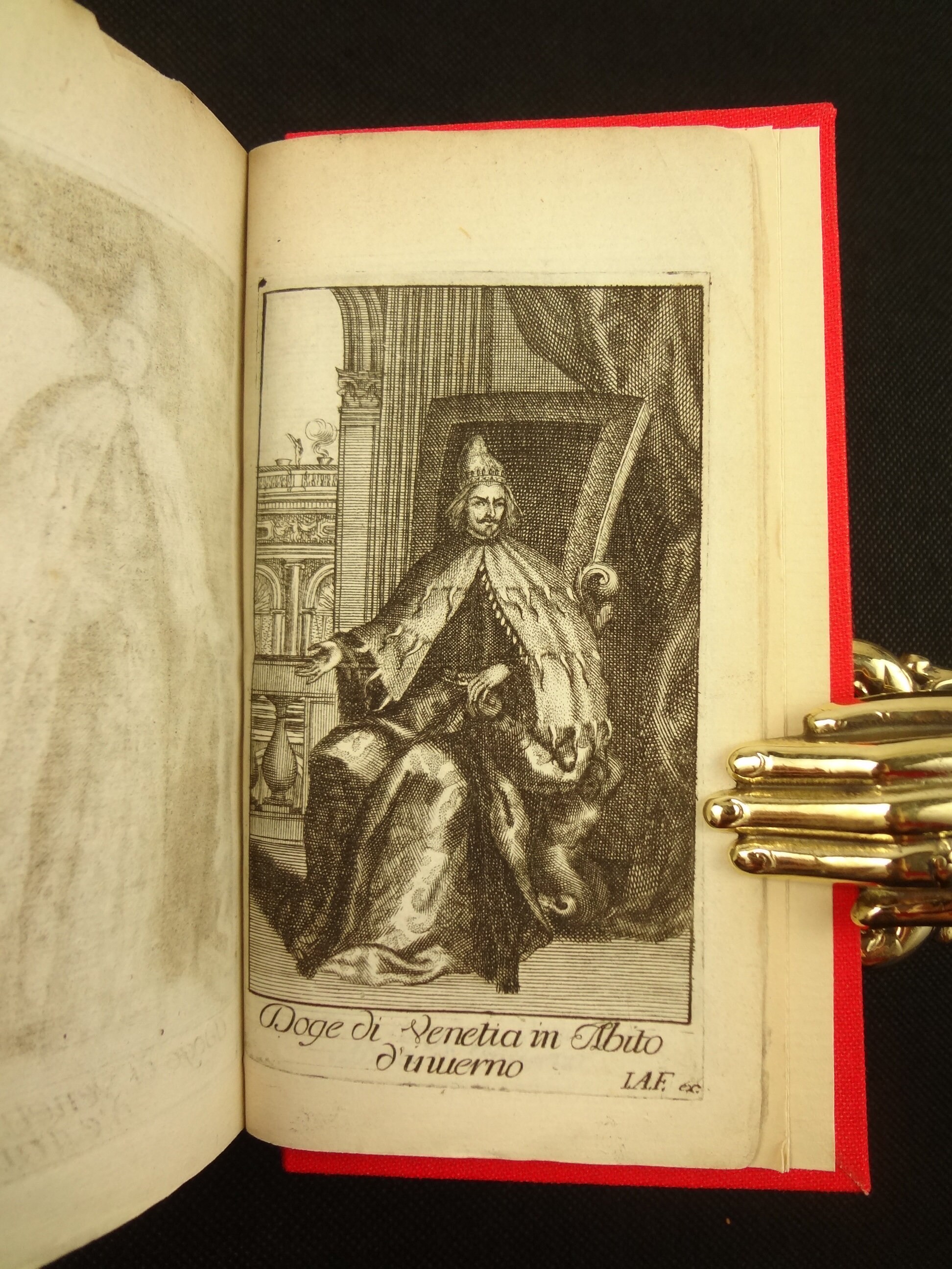 First published in 1682, this is the second edition, printed in 1707, which (at the rear) includes an appendage of families added since the first edition. Also, at the rear, are eleven (of twelve) plates, which I've seen described as postcards of important people in Venice in their costume (includes the Doge, etc.).