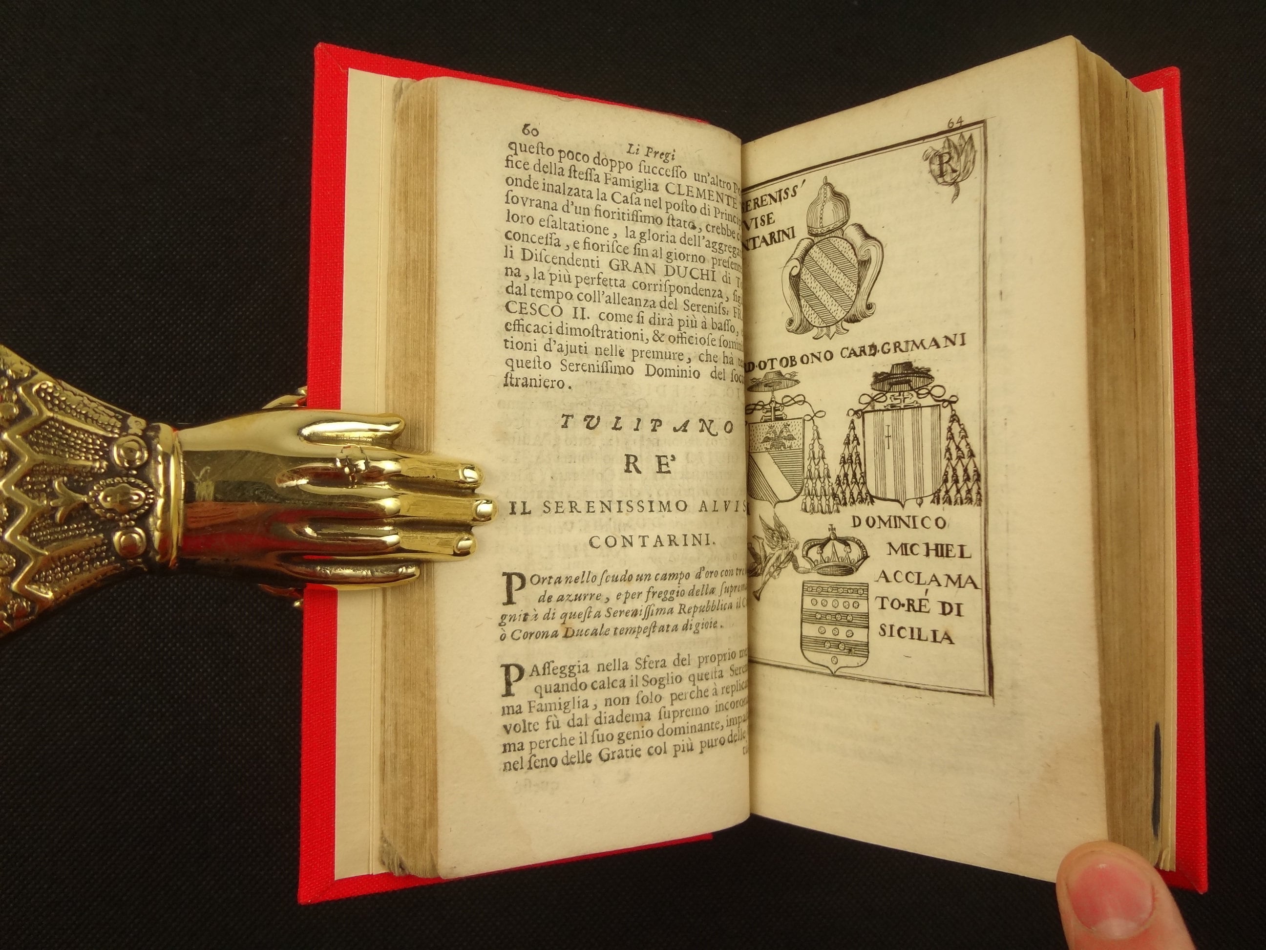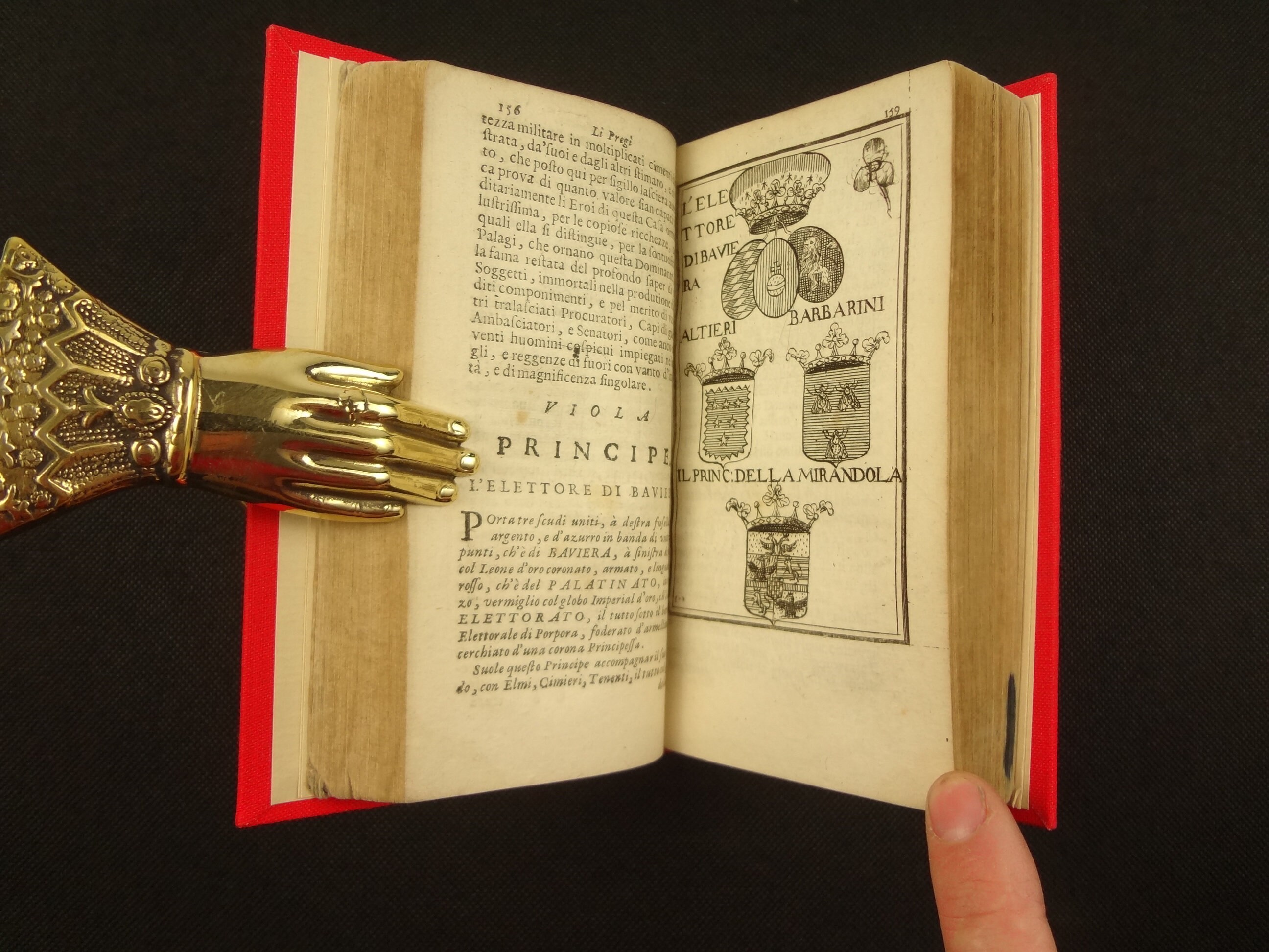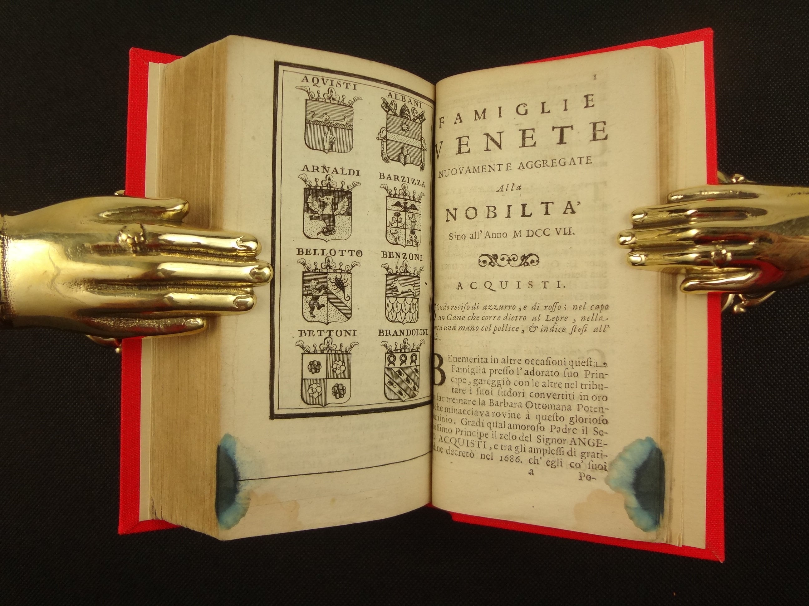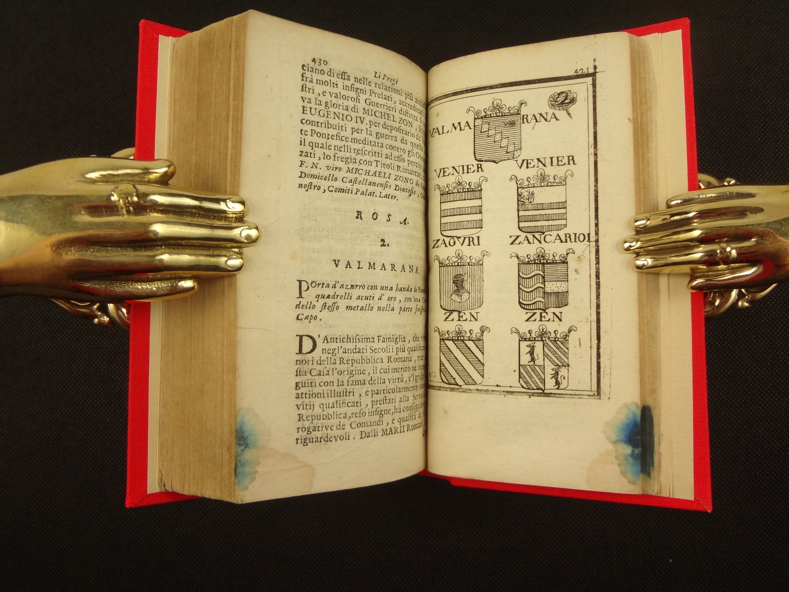First published in 1682, this is the second edition, printed in 1707, which (at the rear) includes an appendage of families added since the first edition. Also, at the rear, are eleven (of twelve) plates, which I've seen described as postcards of important people in Venice in their costume (includes the Doge, etc.).