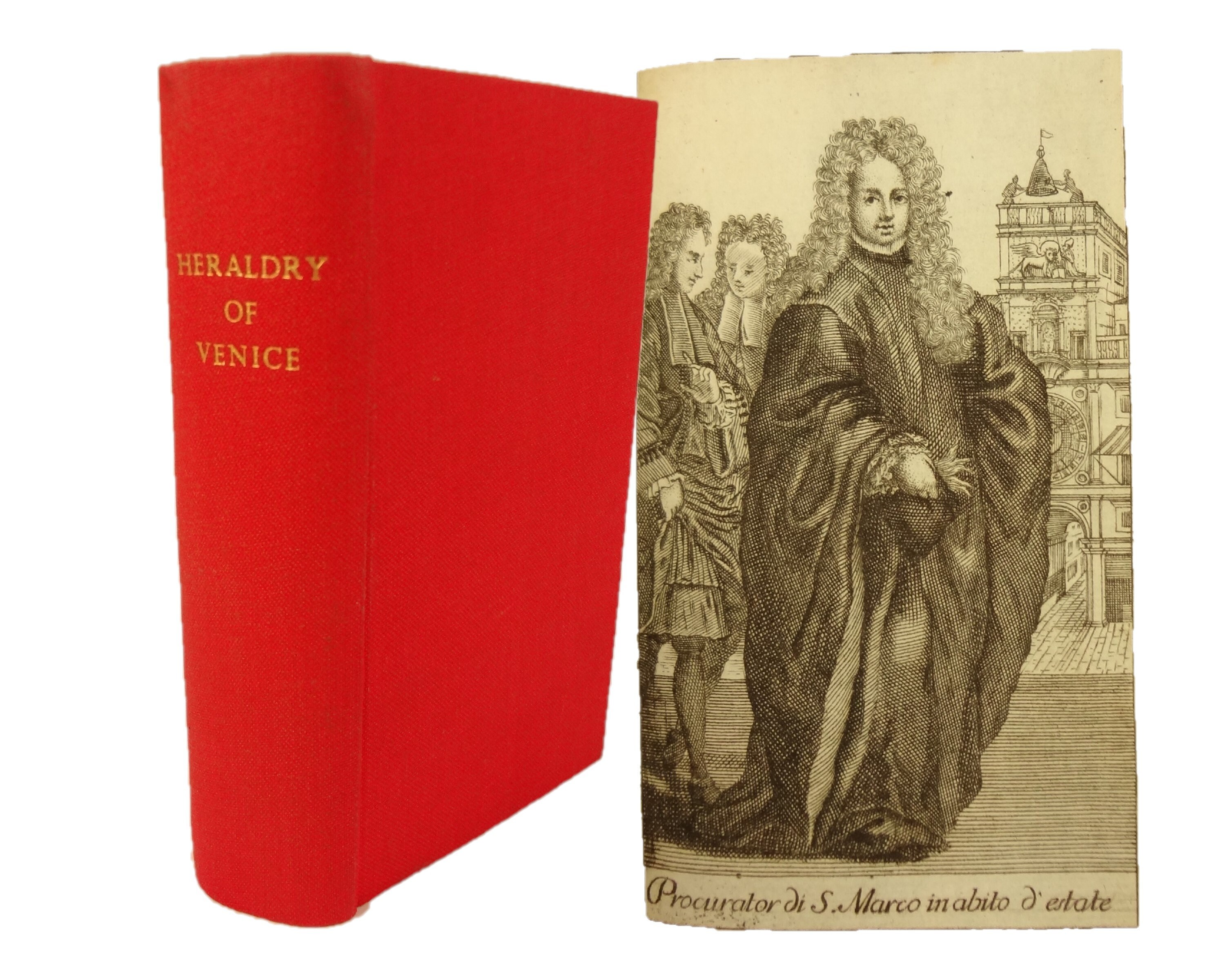 Measures approx. 15 x 8 x 3.5 cm. Hardcover, covered in cloth. "HERALDRY OF VENICE" in gilt on spine. Illustrated.