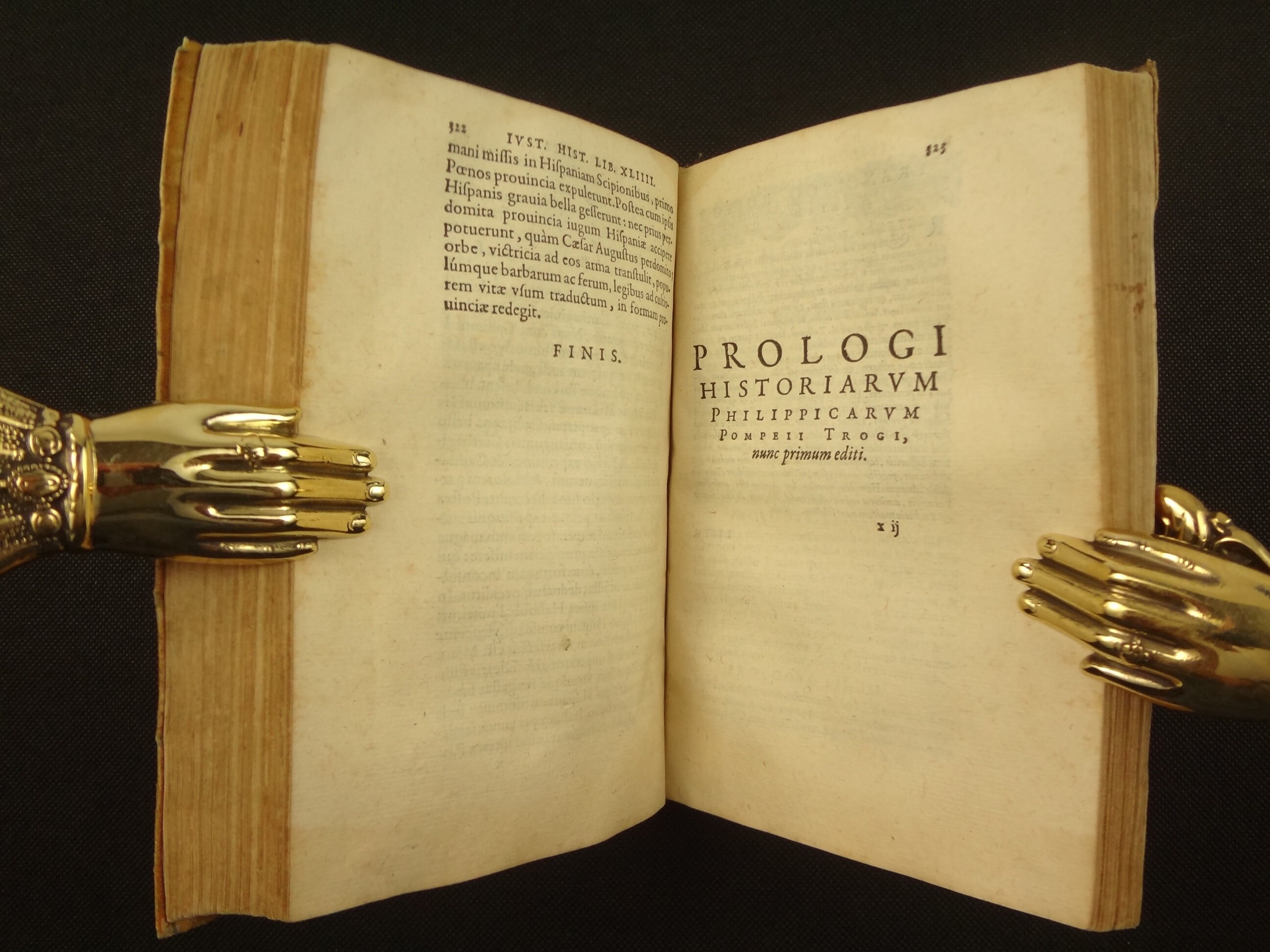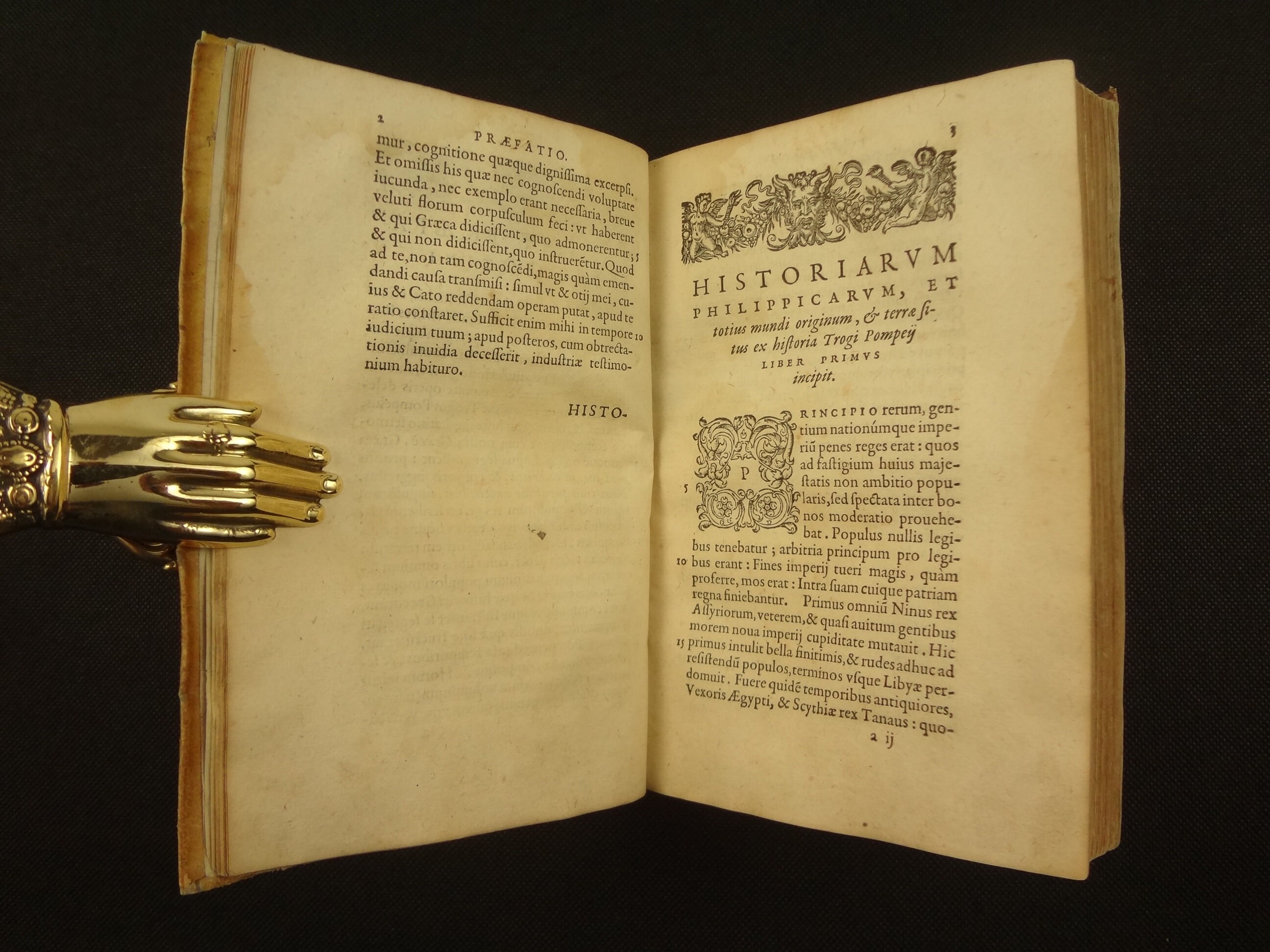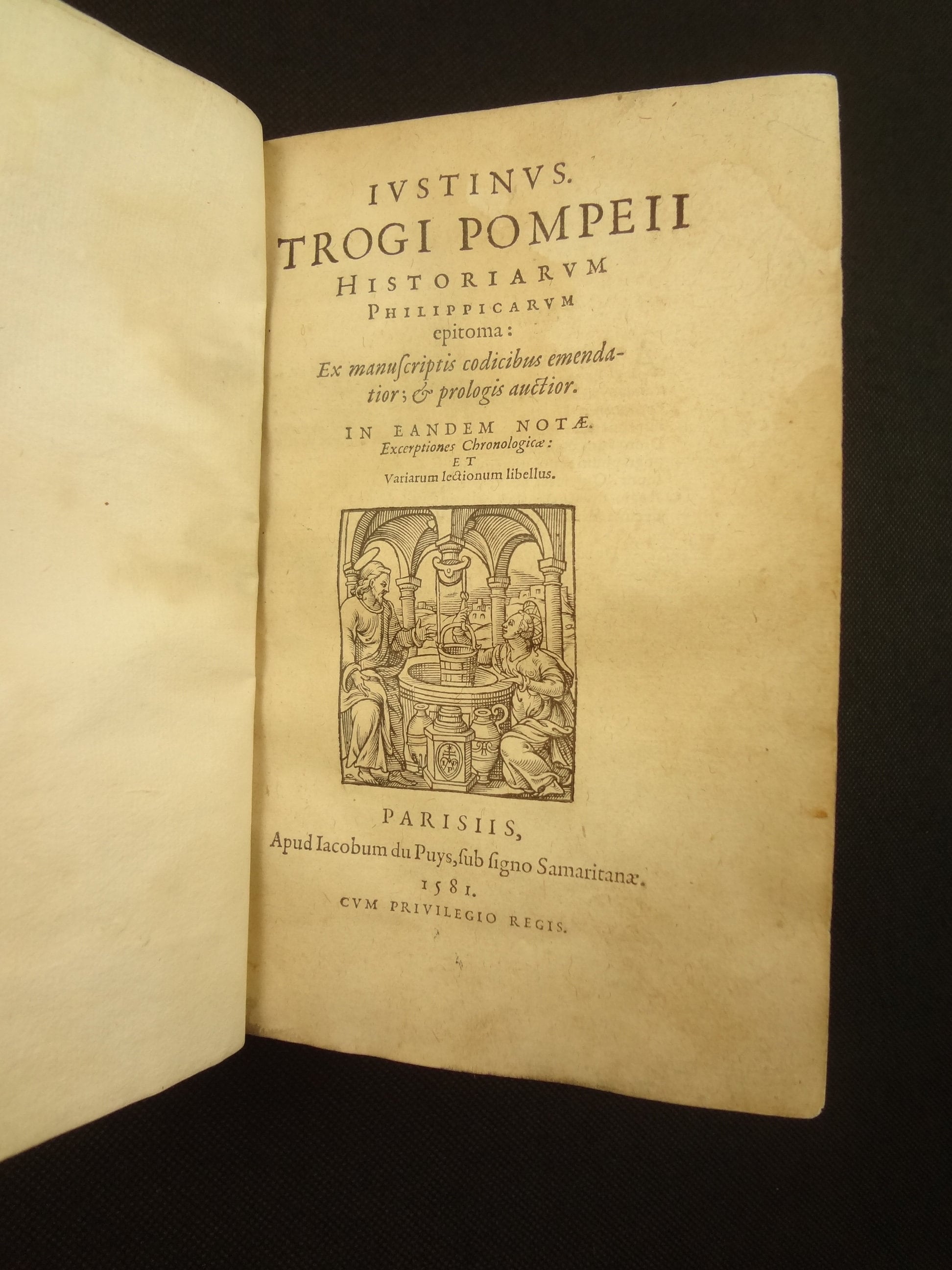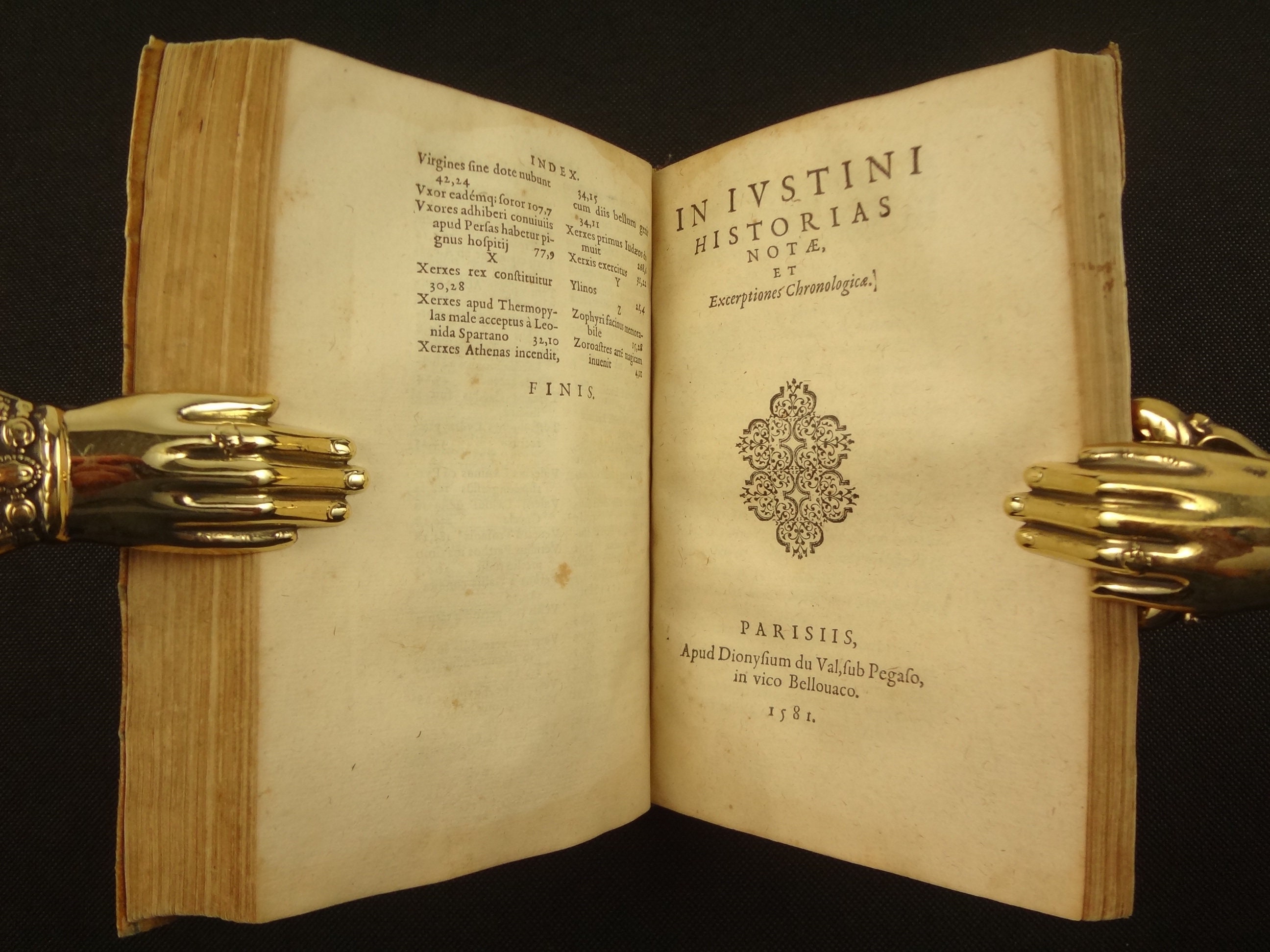 1581 first edition of Jacques Bongars' well-respected, researched and annotated abridgement of the second century's Epitome, by Justin, which Justin gathered from the chronicles of the kings of Macedonia, also known as the Philippic Histories, written in the first century by Trogus (a work lost to history, apart from excerpts used by other authors and Justin's work).