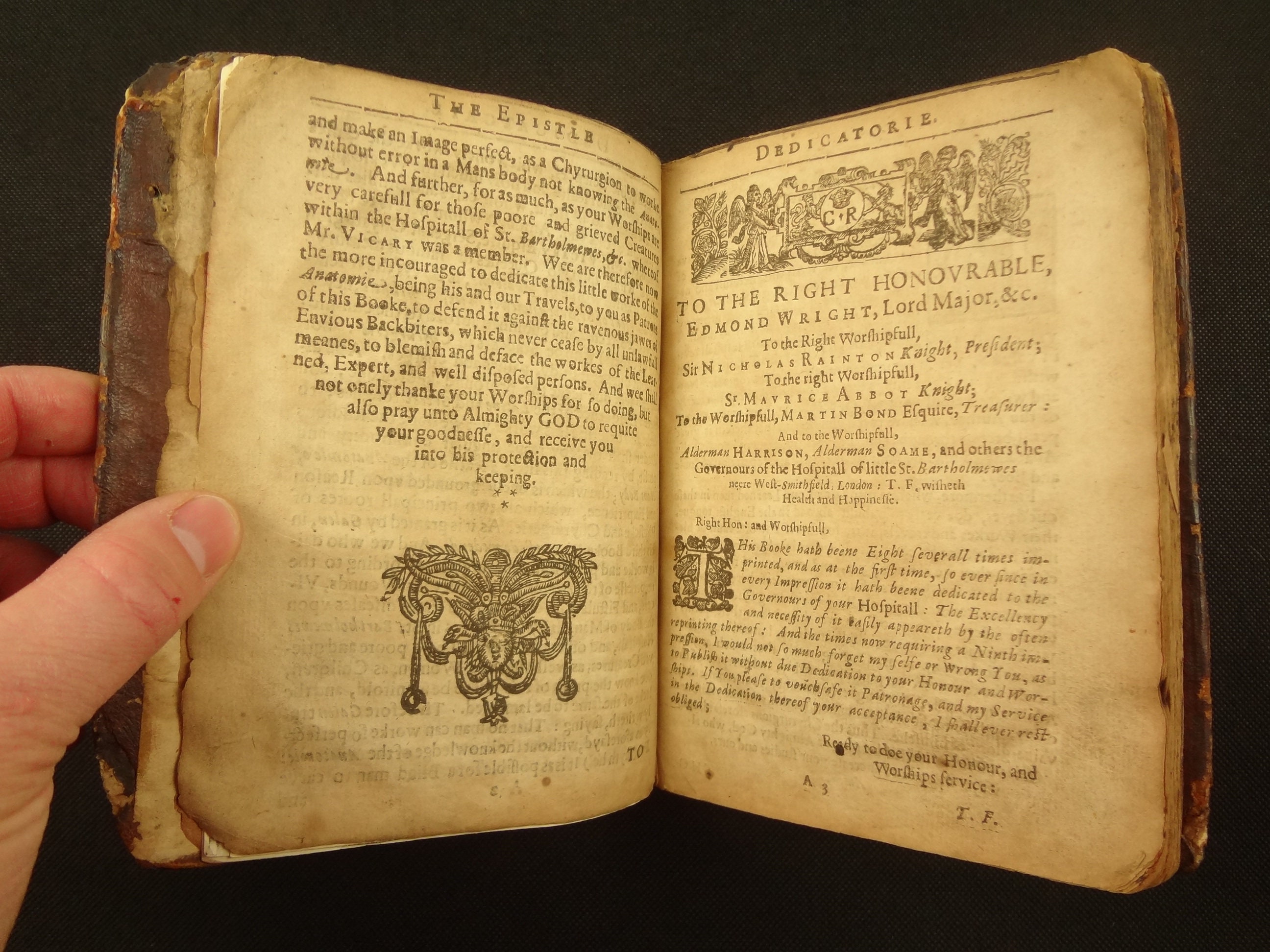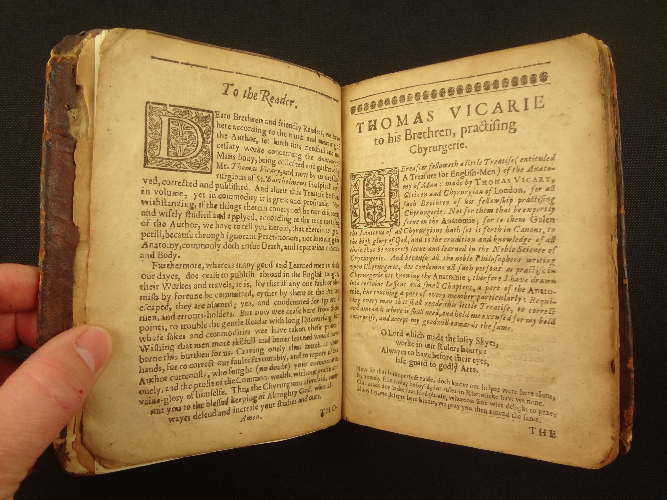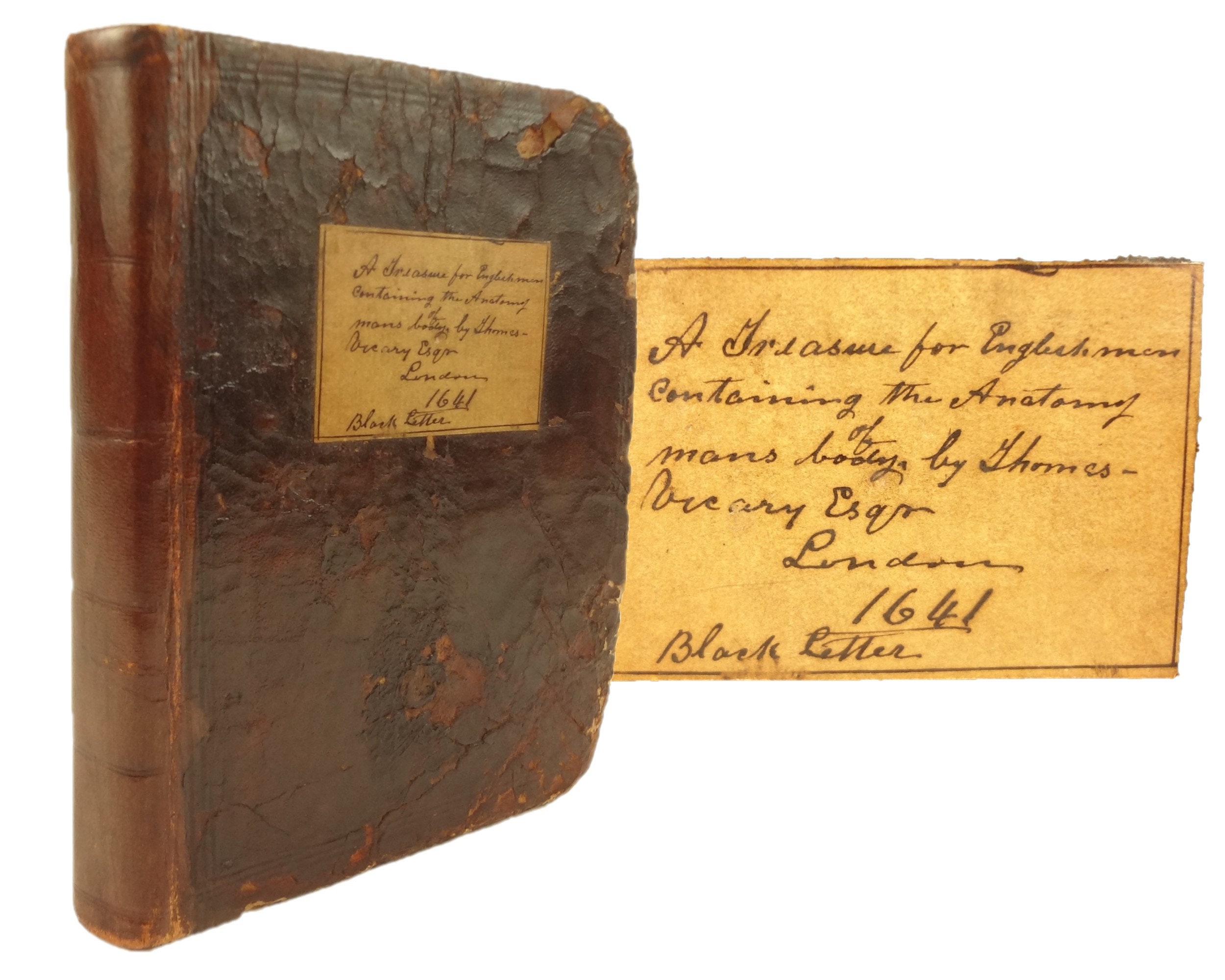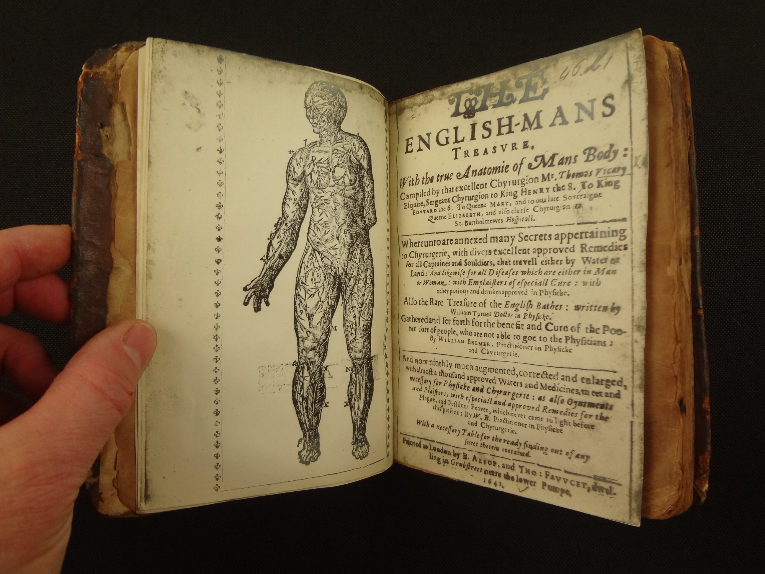 1641 The Englishmans Treasure. With the true Anatomie of Mans Body (Thomas Vicary). Also includes English Bathes, by William Turner, and Waters and Medicines... for Physicke and Chyrurgie:..with especiall and approved Remedies for the Plague... by William Bremer. This edition "augmented, corrected and enlarged" (since the eighth edition, which was 264 pages). And the "annexed secrets" are gathered from the J. Hester work, A short discours... uppon Chirurgie (London, 1580).