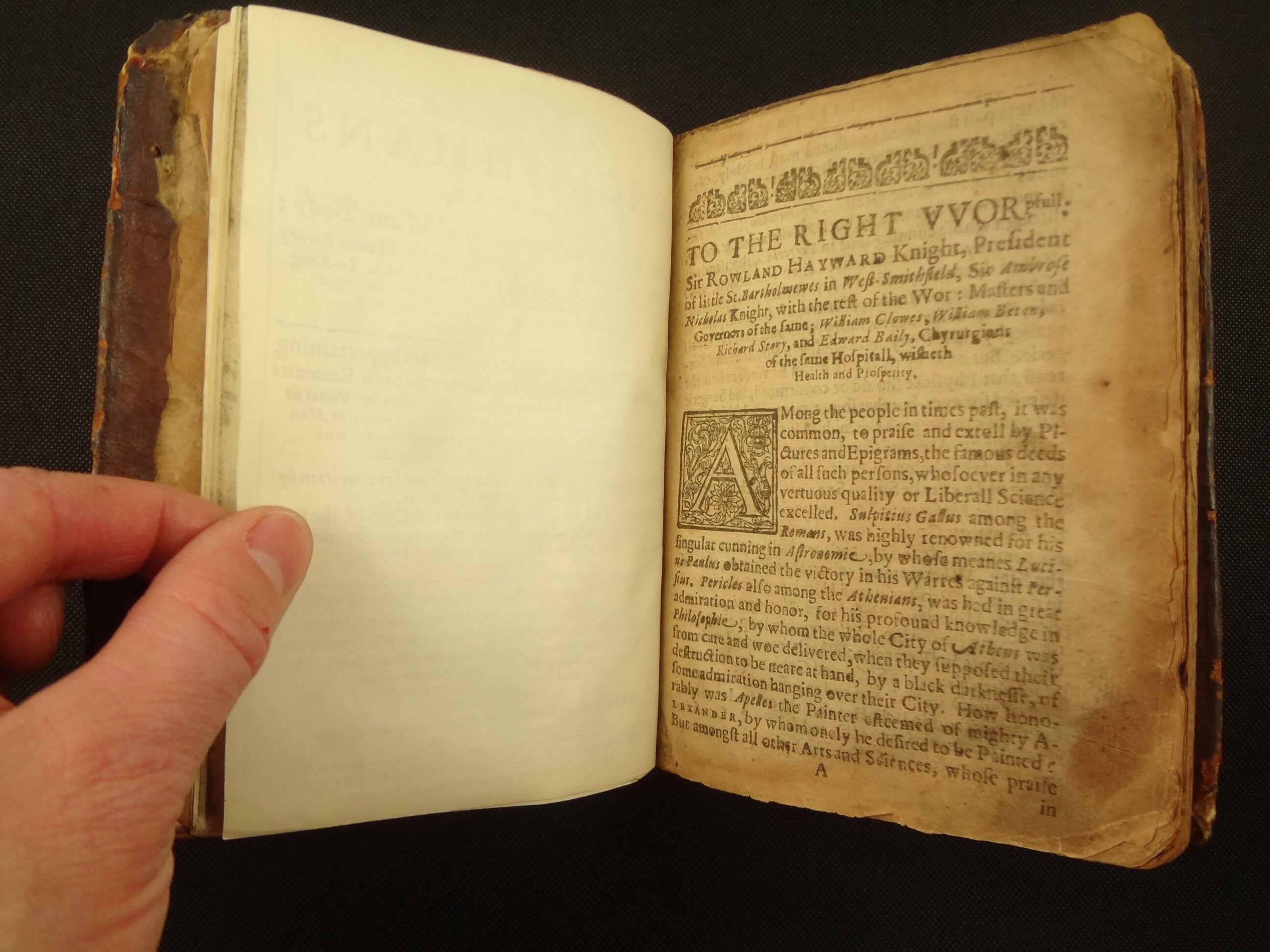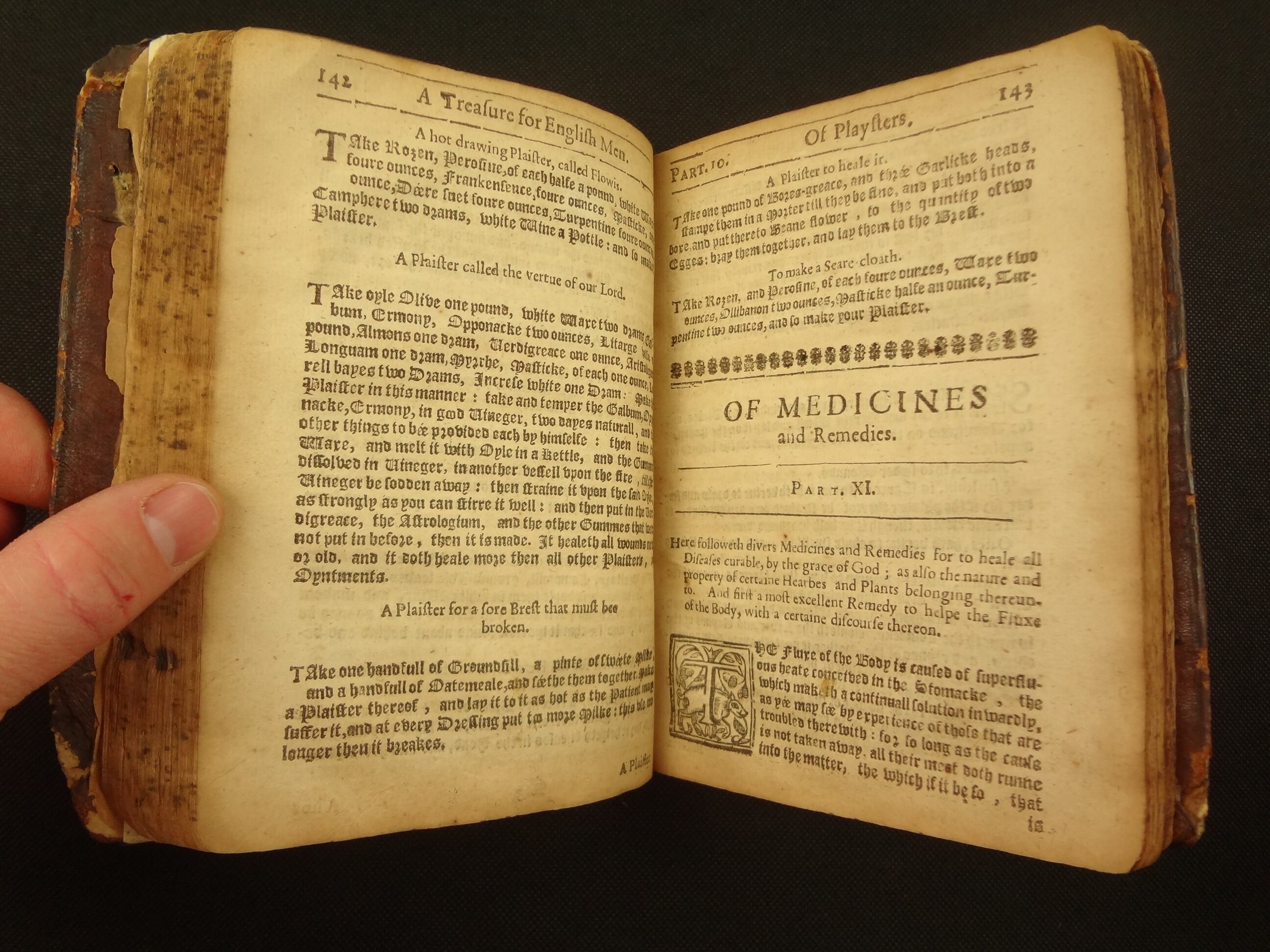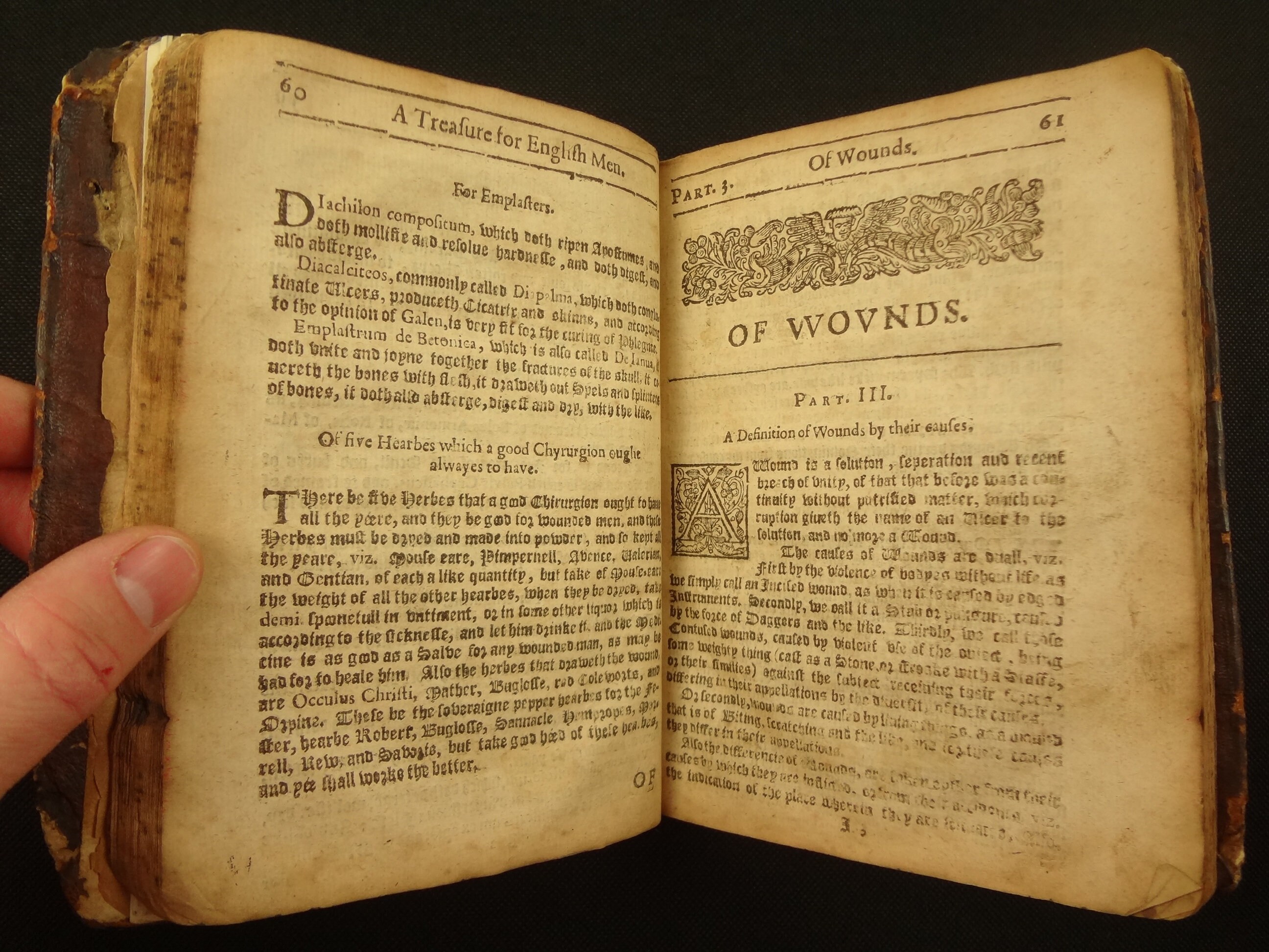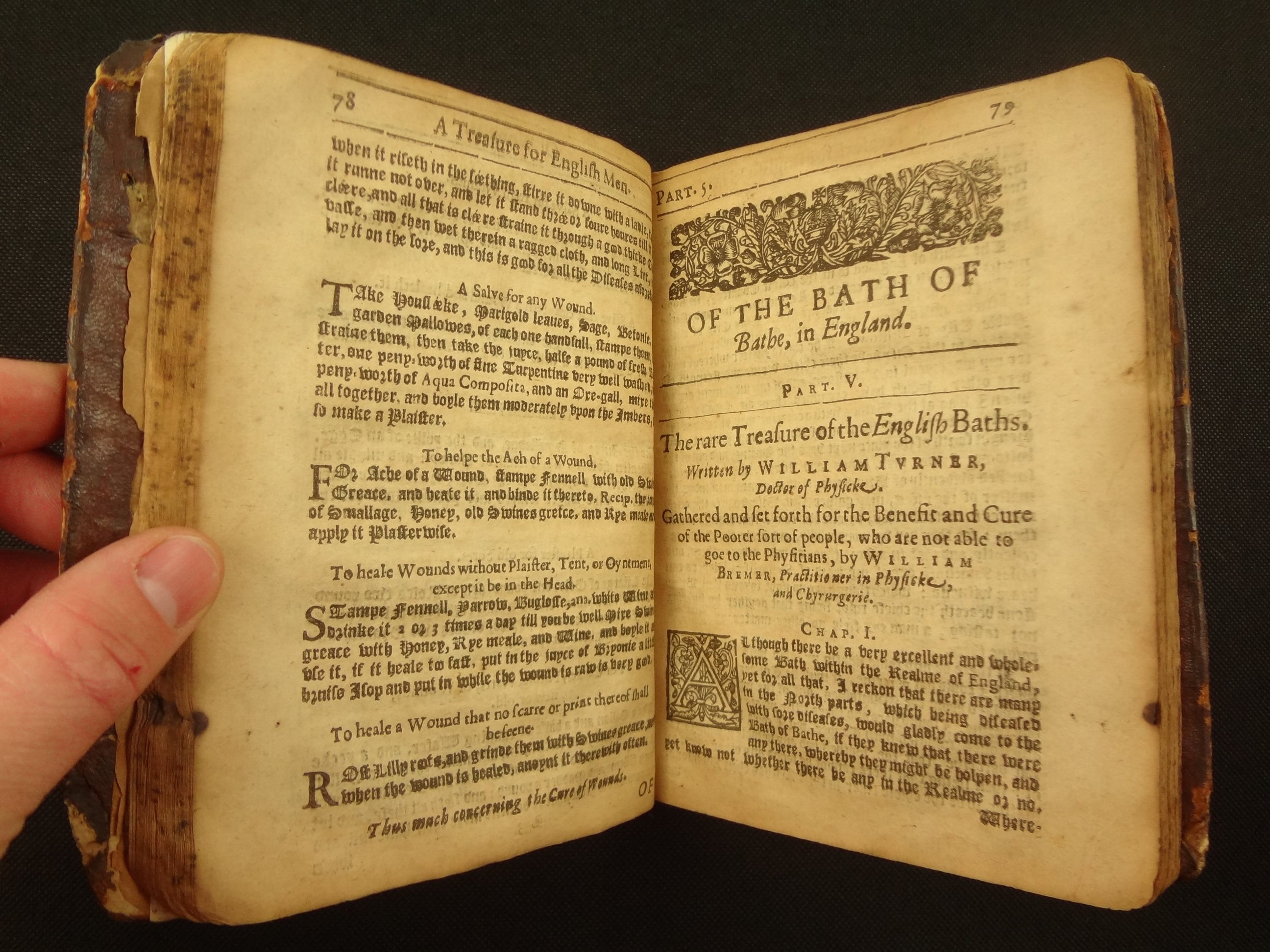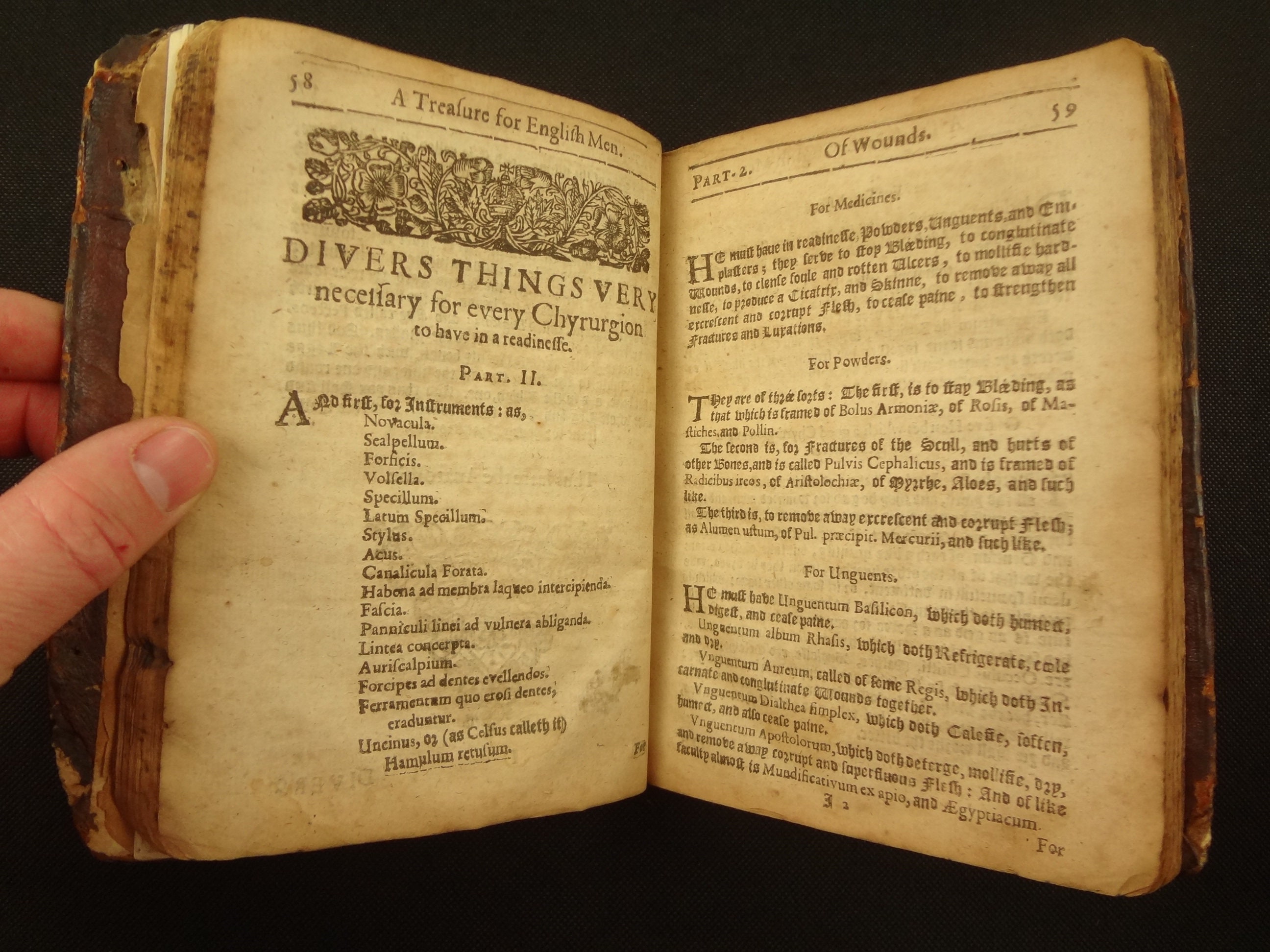 1641 The Englishmans Treasure. With the true Anatomie of Mans Body (Thomas Vicary). Also includes English Bathes, by William Turner, and Waters and Medicines... for Physicke and Chyrurgie:..with especiall and approved Remedies for the Plague... by William Bremer. This edition "augmented, corrected and enlarged" (since the eighth edition, which was 264 pages). And the "annexed secrets" are gathered from the J. Hester work, A short discours... uppon Chirurgie (London, 1580).
